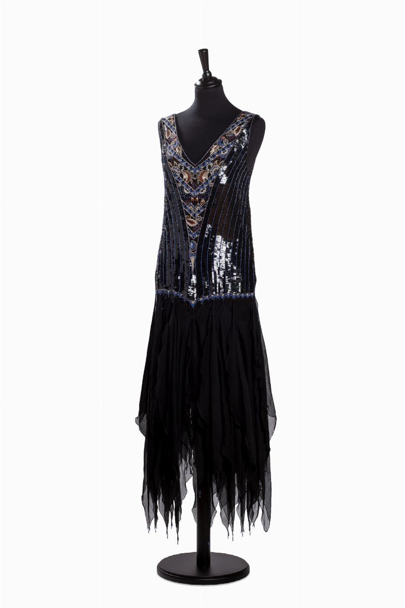 in seta, decorato con paillettes color nero, blu, bianche, ruggine e di perle bianche tubolari, con gonna a volant in seta color nero, tg M/L (difetti)Stima
