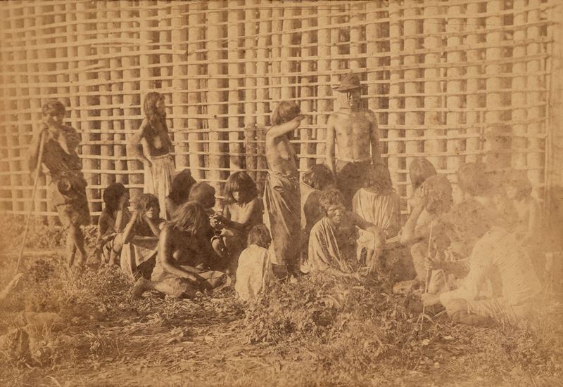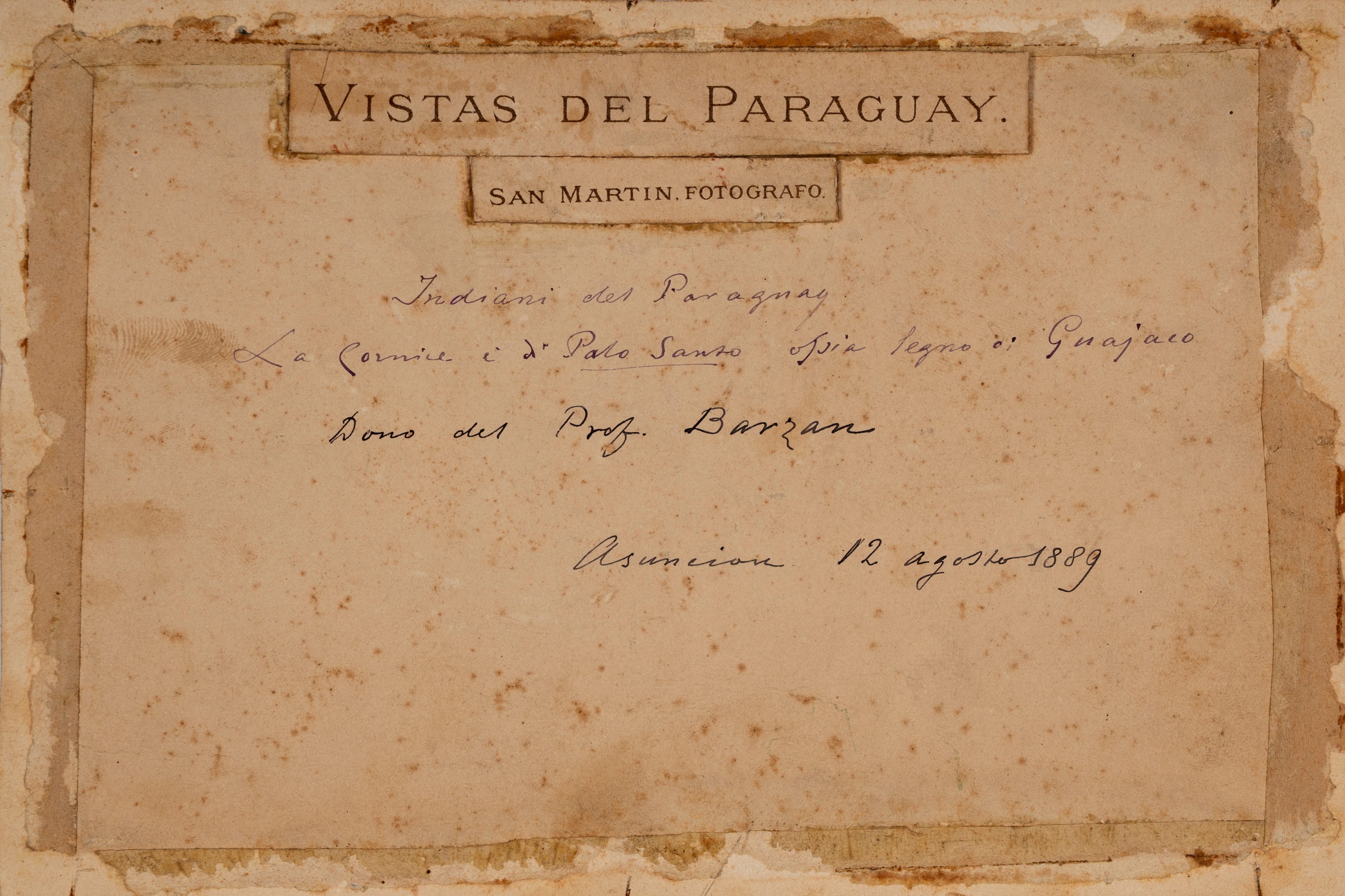 Iscrizione al verso a penna nera: Indiani del Paraguay. La cornice è di Paolo Sanzo in legno di Guayaco. Dono del prof. Banzan. Asuncion 12 agosto 1889