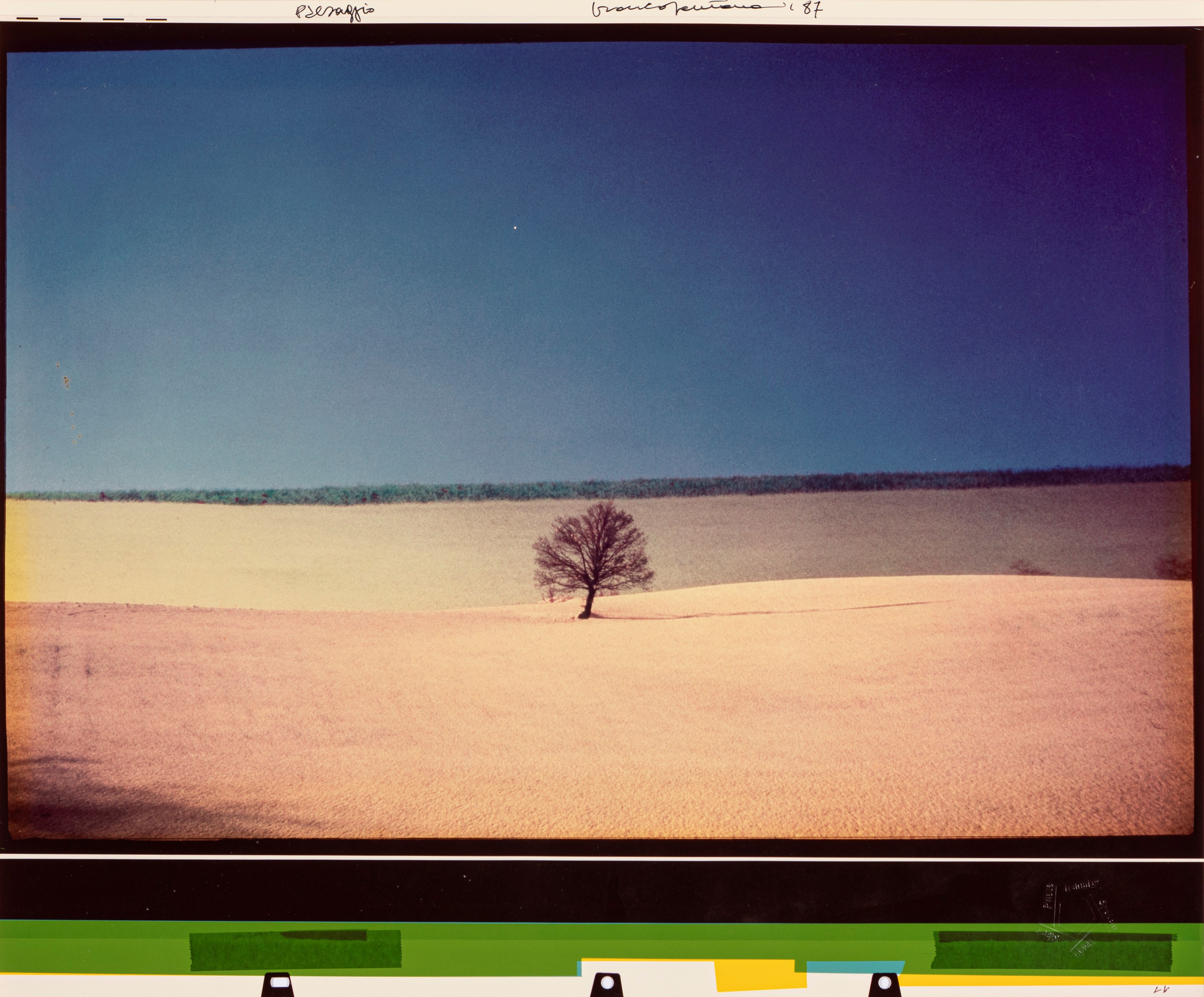 Mentre molti fotografi hanno continuato a prediligere per la sua duttilità e l’indubbio fascino il bianco e nero, Franco Fontana ha intuito che queste stesse caratteristiche potevano essere attribuite anche al colore. È in questo universo cromatico che ha fatto emergere la sua visione del mondo incentrata soprattutto su una riflessione sul paesaggio con sottintesi ma intuibili richiami all’astrattismo. Ogni singola immagine come questa (contraddistinta dai contrasti fra l’azzurro del cielo e il bruno della terra lavorata, fra l’orizzontalità delle linee e la verticalità dell’albero che svetta al centro della scena) racchiude le caratteristiche delle sue ricerche in questo campo. Anche quando decide di posare il suo sguardo sugli Stati Uniti resta fedele alla sua visione: il viaggio sulla leggendaria Route 66 diviene così una personale interpretazione del reportage in un racconto punteggiato di visioni improvvise e di colori saturi.