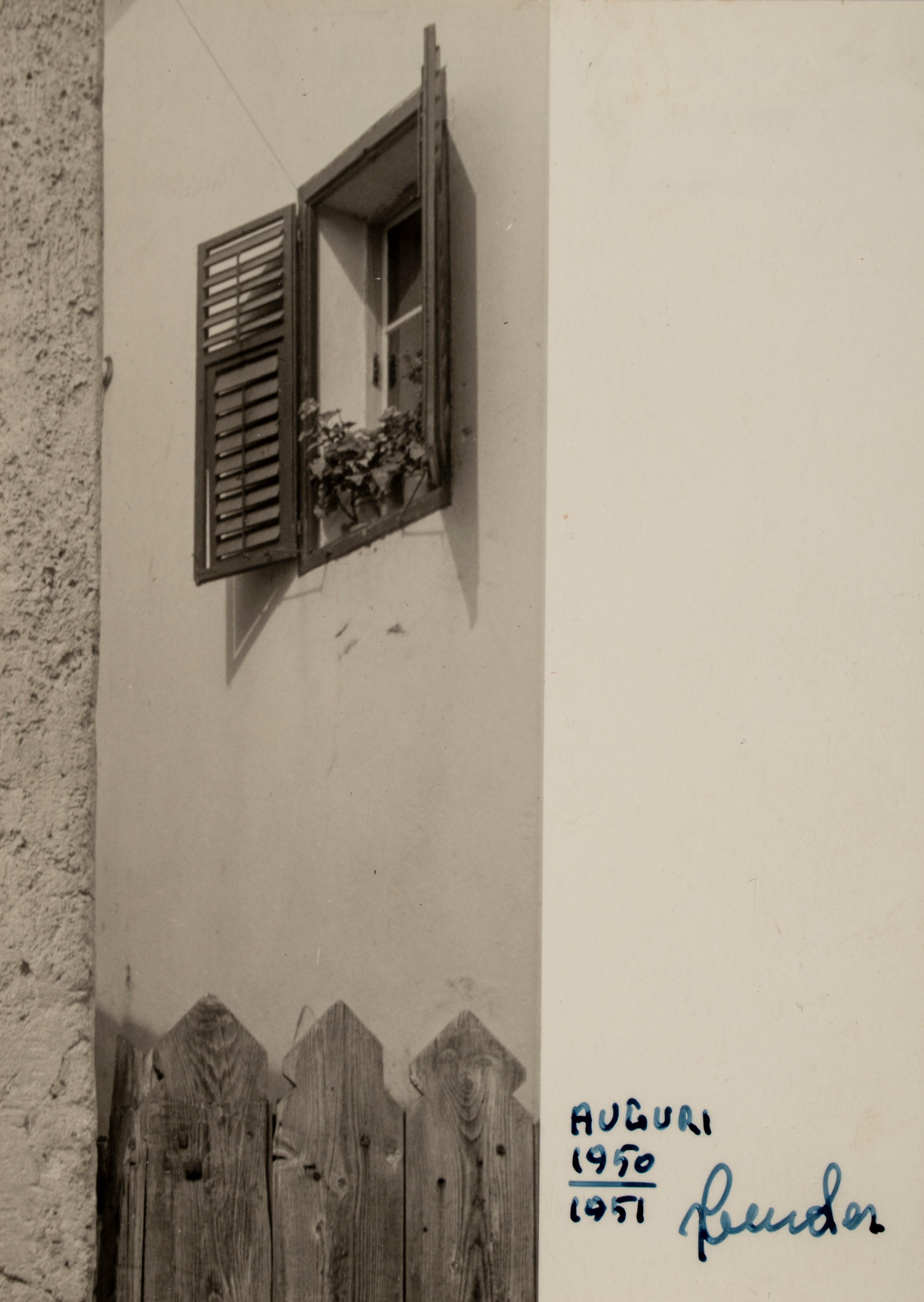 I punti di riferimento culturali di Vender sono numerosi e vanno dalla fotografia tedesca degli anni ’20 al Pittorialismo con un occhio rivolto, anche se in modo non dogmatico, a quell’idea ispirata all’estetica crociana dell’accurata stampa in high key, dominata cioè dai toni chiari. Sono esattamente questi a caratterizzare le due piccole stampe realizzate come auguri di buon anno (nel mondo anglosassone il termine in uso è Christmas card) per l’anno 1951. Qui i soggetti sono una casa la cui facciata diviene lo spazio che il fotografo utilizza per mettere in sintonia la finestra in alto e la staccionata in basso e il profilo di una chiesa che si staglia sullo sfondo, sovrastato dall’ampio spazio del cielo. In questo secondo caso siamo di fronte a un vero esercizio di stile in una stampa che gioca su tutte le sfumature del bianco attraversato dalle delicate increspature delle nuvole nel cielo e dai pochi punti neri che indicano la porta, due finestre e la campana della chiesa.