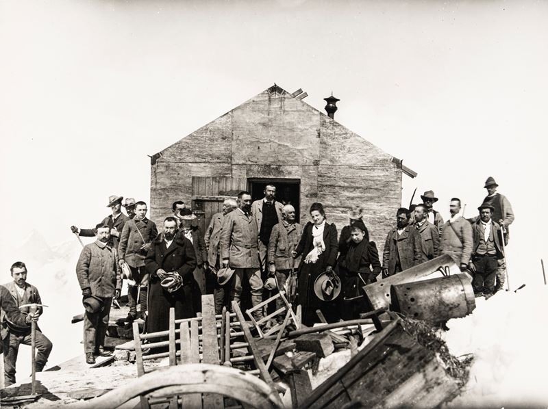 La Regina Margherita con il seguito alla capanna, presenti i responsabili alla costruzione, 1893