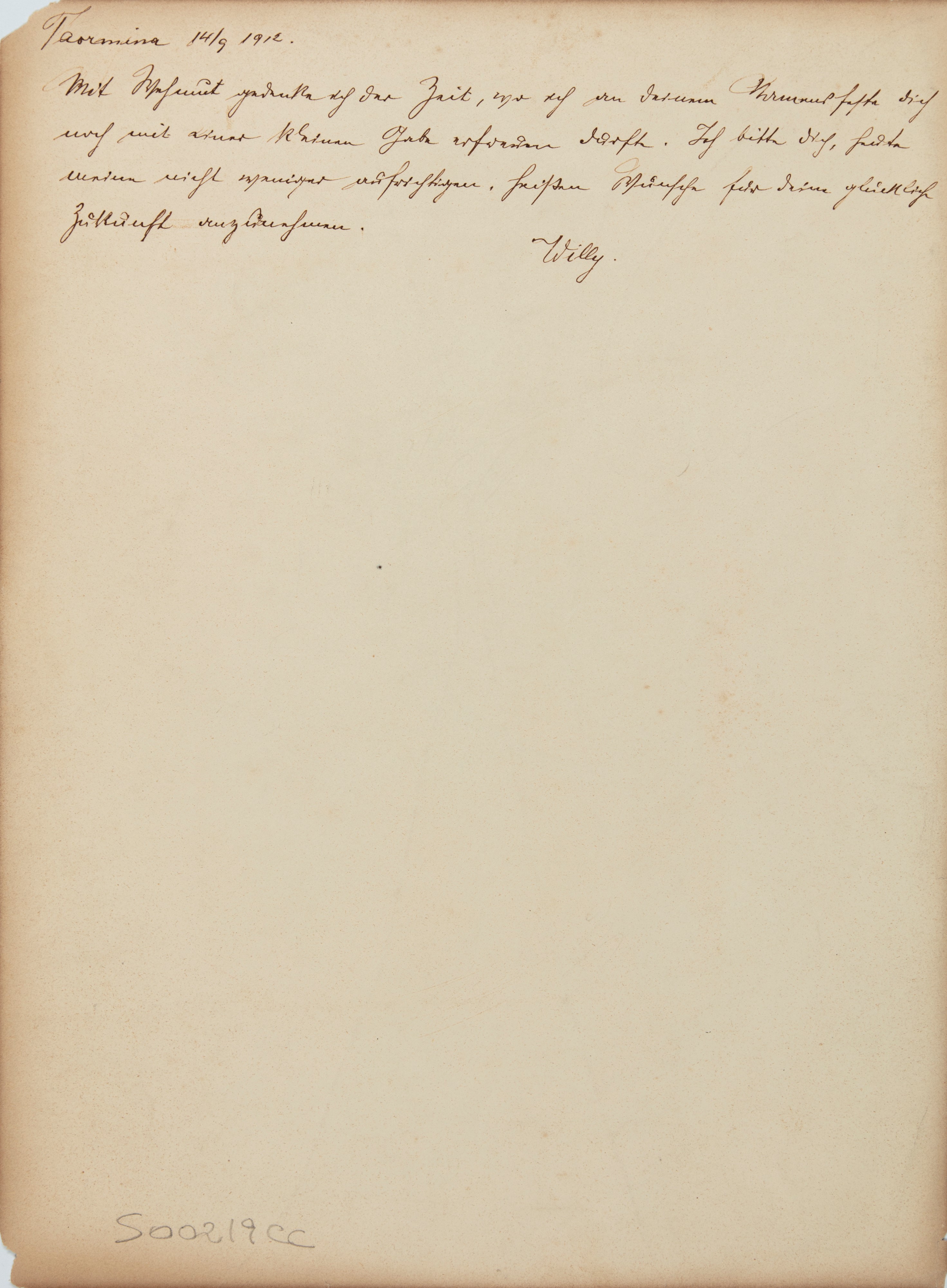 Dedica al recto "Taormina, 14 settembre 1912. Con malinconia ricordo il tempo in cui, per la tua festa, potevo ancora rallegrarti con un piccolo dono. Ti prego di accettare oggi i miei non meno sinceri e ardenti auguri per la tua felice futura esistenza. Willy"