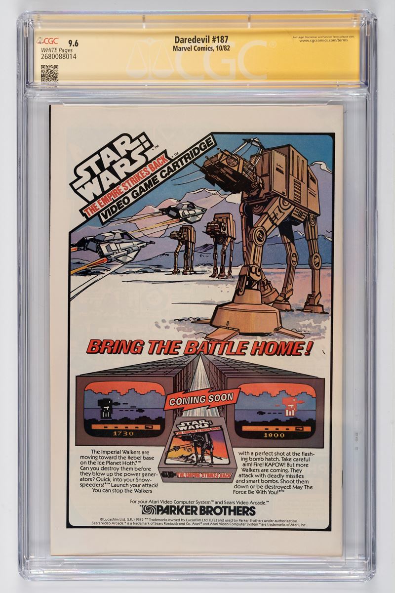 Copia di “Daredevil #187” (1982) gradata da CGC (9.6) e autografata da Frank Miller. Pubblicato nel 1982, Daredevil #187 (intitolato "Over and Out") è un tassello fondamentale della leggendaria gestione di Frank Miller, che in questo numero firma sia i testi che i disegni (con le iconiche chine di Klaus Janson). In questo numero, Matt Murdock affronta una delle sue sfide più grandi: la perdita temporanea del suo "senso radar" a causa di un'esplosione. Miller priva l'eroe della sua bussola sensoriale, trasformando la storia in una lotta per la sopravvivenza in cui Matt deve fare affidamento esclusivamente sul suo addestramento e sulla sua forza di volontà. È il numero che definisce l'essenza di Daredevil: un uomo che, anche quando viene privato di tutto ciò che lo rende "super", trova la forza di rialzarsi. È l'opera che ha cementato l'estetica "urban ninja" degli anni '80.