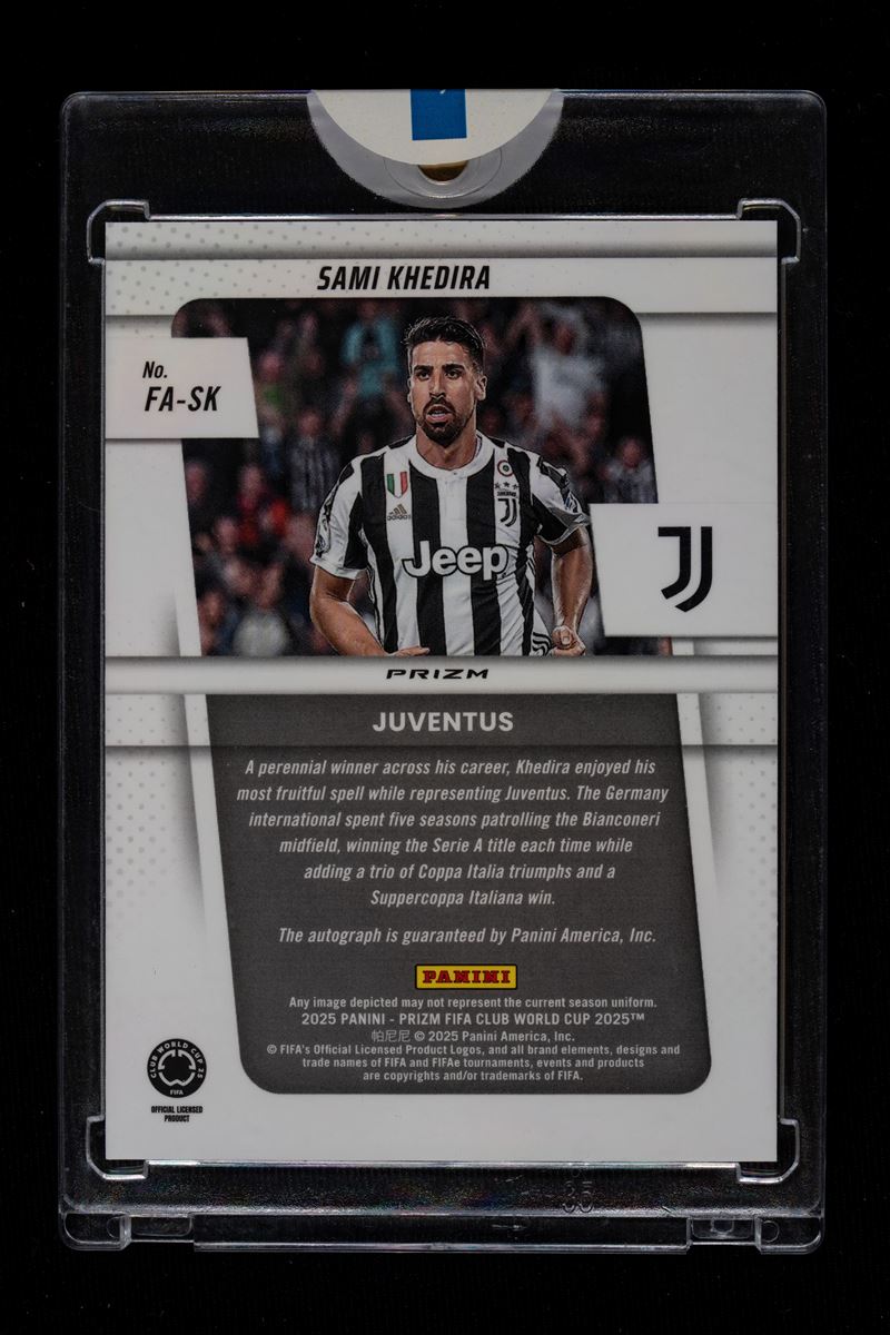 Card autografata di Sami Khedira con la maglia della Juventus, pubblicata dalla Panini per la serie Prizm Fifa WC Blue 2024/25.