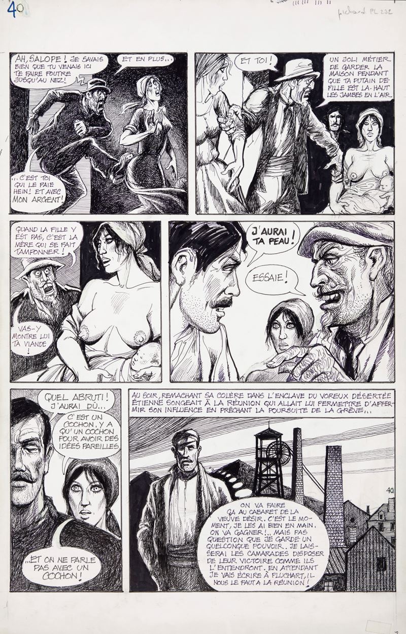 Tavola originale realizzata da Pichard per "Germinal", pubblicata a pag. 40 dalla casa editrice francese Magic Strip nel 1992. Adattamento in chiave erotica del celebre romanzo "Germinale" di Émile Zola, al quale Pichard conferisce con uno stile unico un'atmosfera sulfurea, oscena e drammatica.