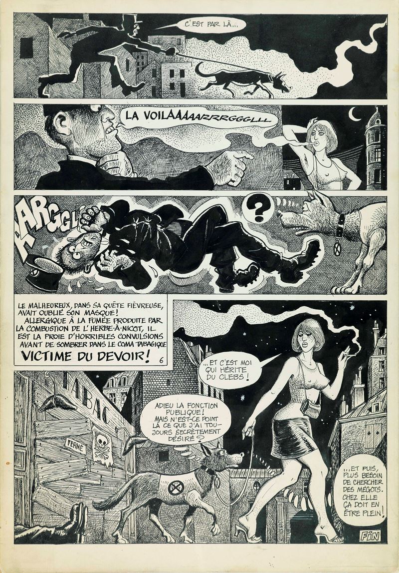 Tavola originale realizzata da Pichard per la pag. 6 di questa storia breve intitolata "Victime du devoir", edita per la prima volta sulle pagine della rivista francese L'Echo des Savanes n. 82 Bis nel Novembre 1981.