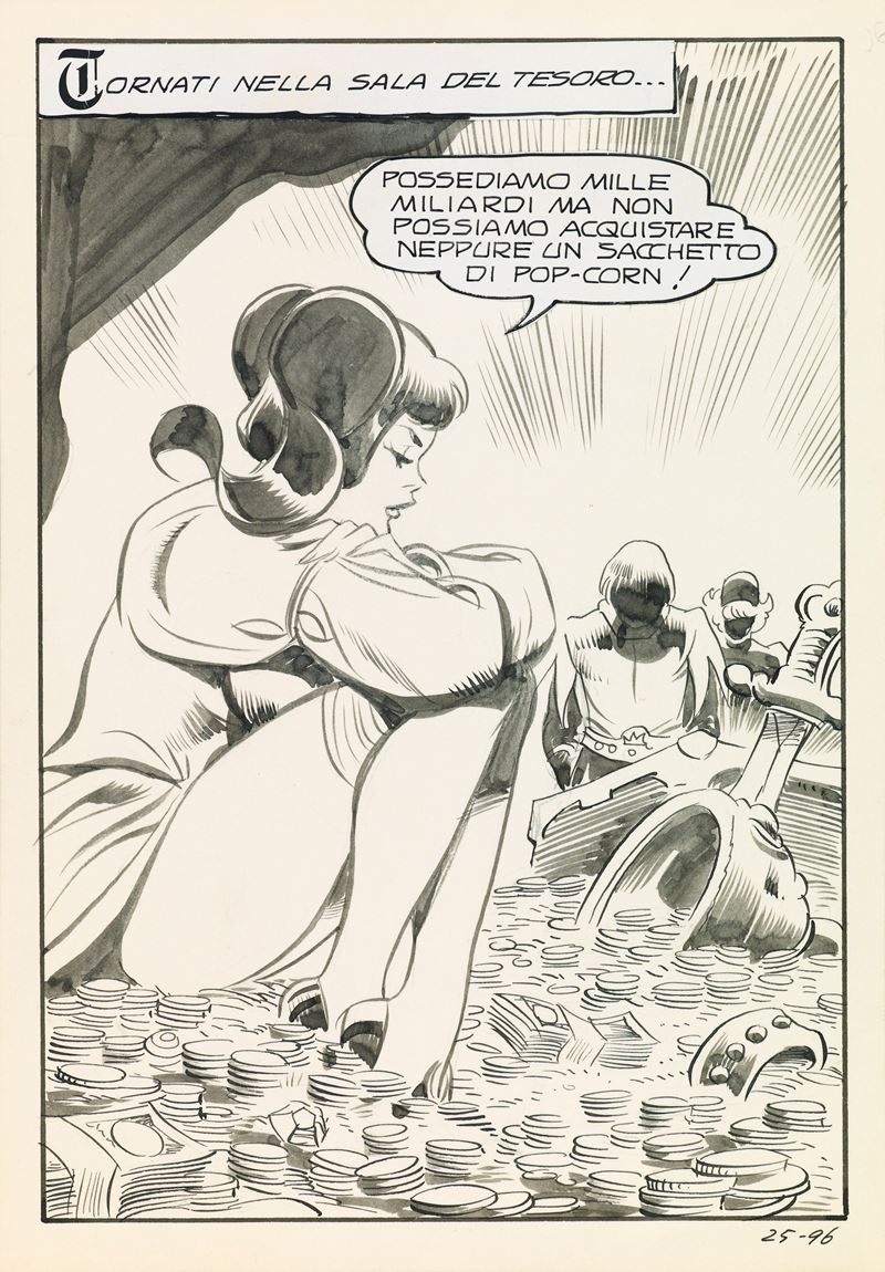 Tavola originale realizzata da Frollo per "L'oro dei ladroni", edita su Biancaneve n. 25 a pag. 96 dalla Edifumetto nel 1974. Opera utilizzata come copertina per "L'Uomo Lupo", edita su Biancaneve n. 58 dalla Edifumetto nel 1977.