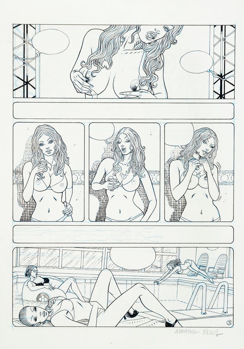 Tavola originale realizzata da Scacchia per "Mona agent X", edita a pag. 3 dall‘editore francese Blanche nel 2011. Firmata.