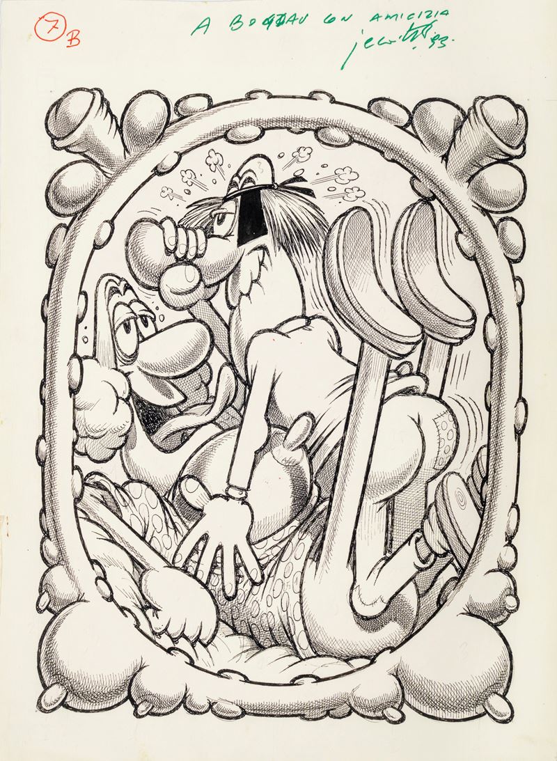 Illustrazione originale inedita realizzata da Jacovitti per il suo capolavoro erotico "Kamasultra" edito per la prima volta dalla casa editrice Maga Publicitas nel 1977. Acquerellata al retro. Firmata e dedicata con data postuma.