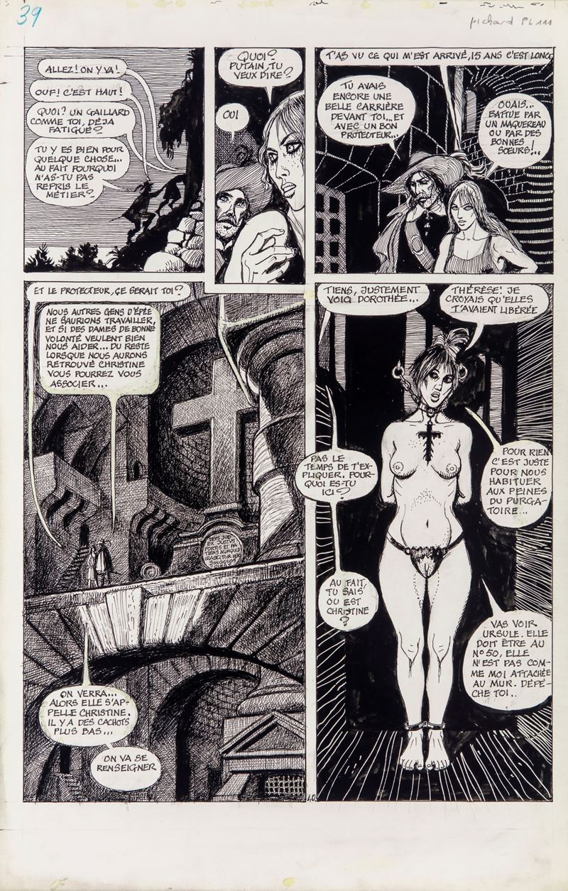 Tavola originale realizzata da Pichard per "Marie-Gabrielle de Saint-Eutrope" edita a pag. 40 dalla casa editrice francese Glénat nel 1977. Una delle più celebri opere del maestro dell'eros francese che lo consacrarono a livello mondiale.