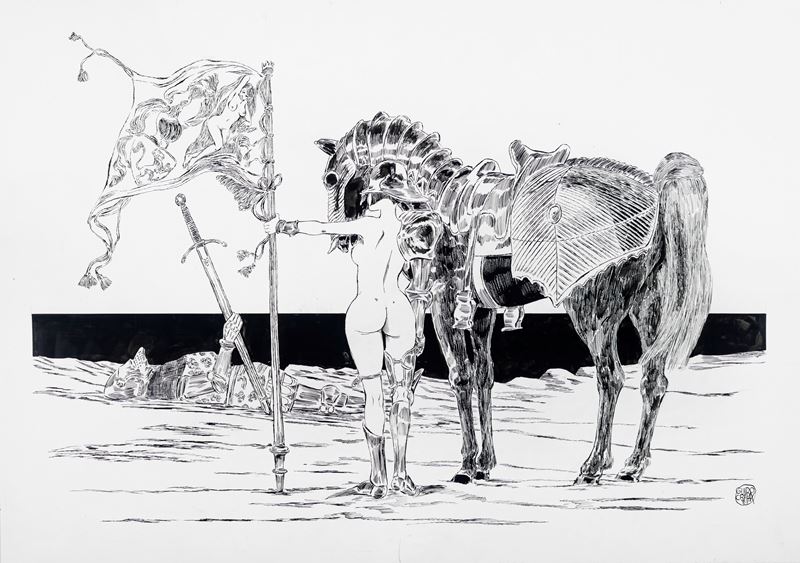 Illustrazione originale di grande formato realizzata da Crepax nel 1998 per la celebre litografia intitolata "Valentina, le armi, l'amore". Firmata e datata.