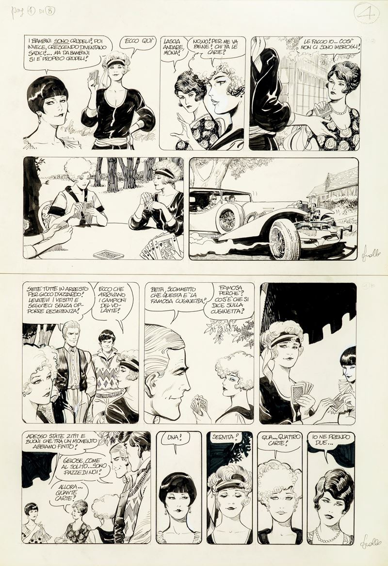 Tavola originale realizzata da Frollo per "Entra in scena Mona Street", prima avventura erotica della sua Mona edita a pag. 4 nel volume Mona Street 1: The Secret Books of Glamour dalla Glamour International nel 1988. Pubblicata in Francia nello stesso anno con il titolo "L'entrée en scène de Mona Street", segna la consacrazione di Frollo nell'Olimpo del fumetto erotico d'autore a livello mondiale. Siamo nella Boston degli anni Venti del Novecento, Mona Street è una scaltra fanciulla da poco uscita dal college, curve morbide candidamente ostentate, un viso innocente dallo sguardo ironico e un sorriso appena accennato sulle labbra. Mona Street è un normale nome inglese, ma se si pensa che Leone Frollo è veneziano allora il giocoso equivoco verbale diventa intuitivo. L'ammiccamento malizioso c'è già nel nome, dunque, ma tutte le storie di Mona Street sono sottese di ammorbante erotismo, ingegnosamente narrate dall'autore che, con un tratto morbido e voluttuoso a matita o china, ha tracciato un personaggio ben diverso dalle altre "eroine del fumetto" quasi sempre succubi dell'uomo: Mona ha una personalità da falsa ingenua che si prende gioco di tutti, diventando a volte vindice del proprio sesso. Su due pannelli. Firmata.
