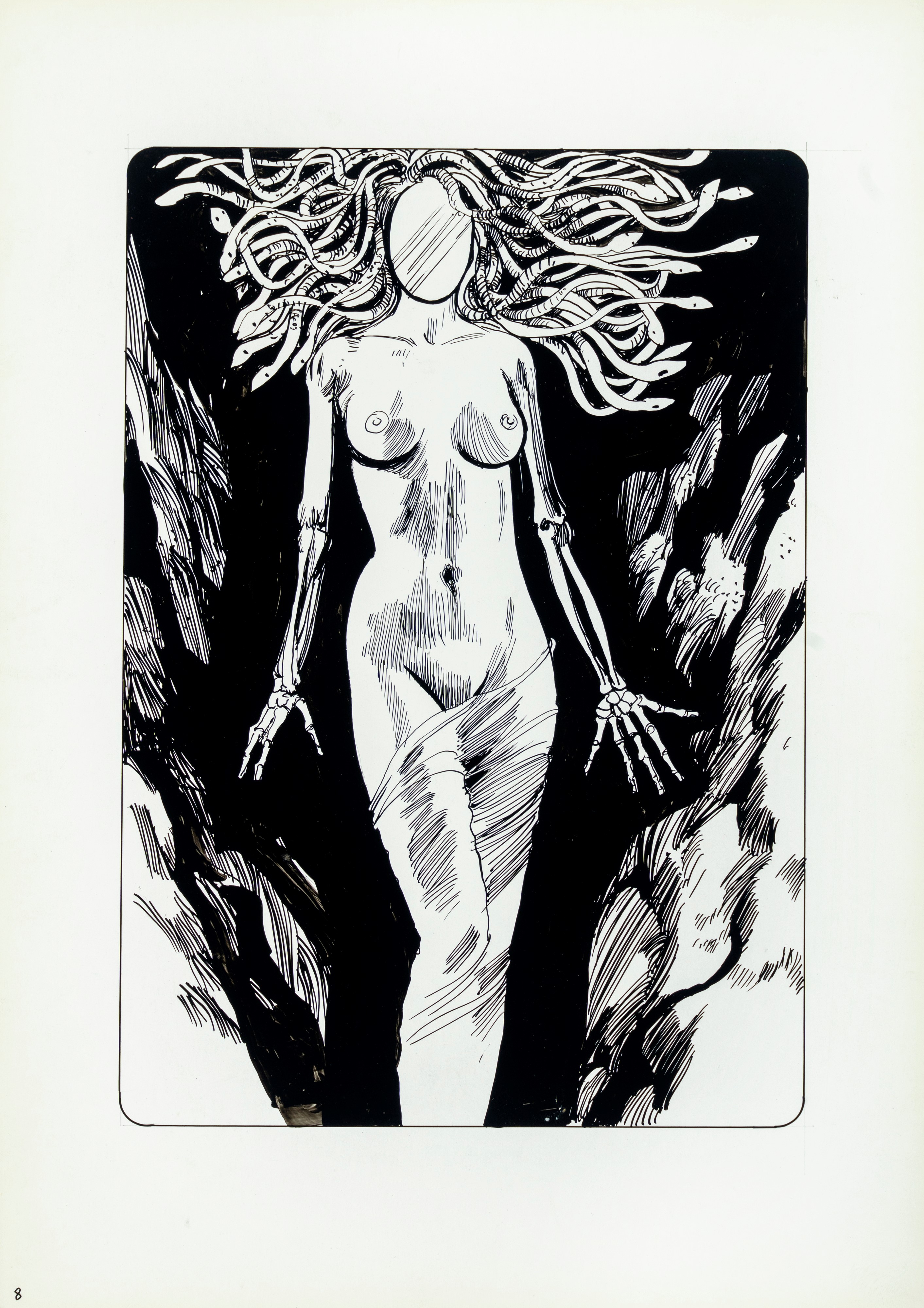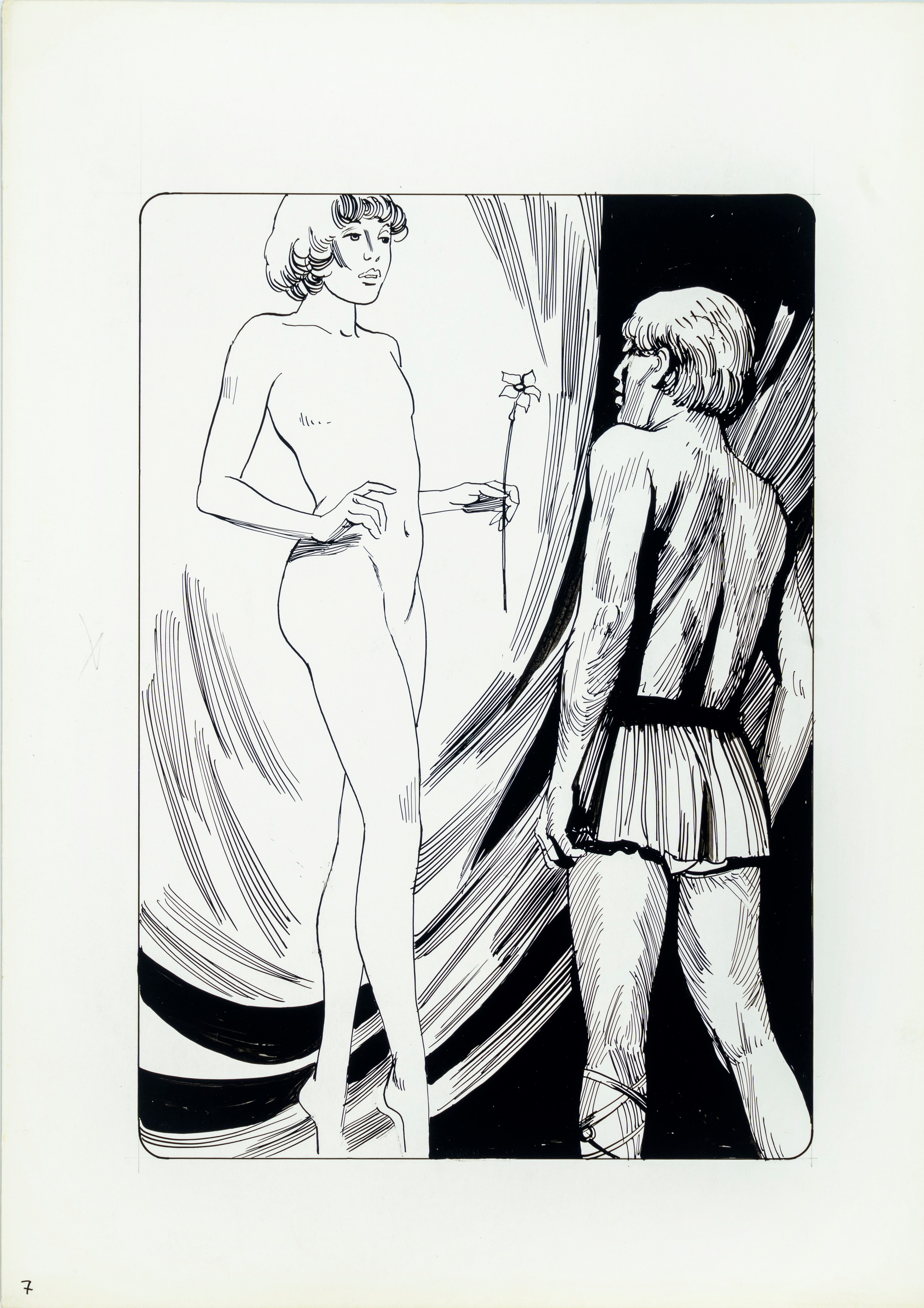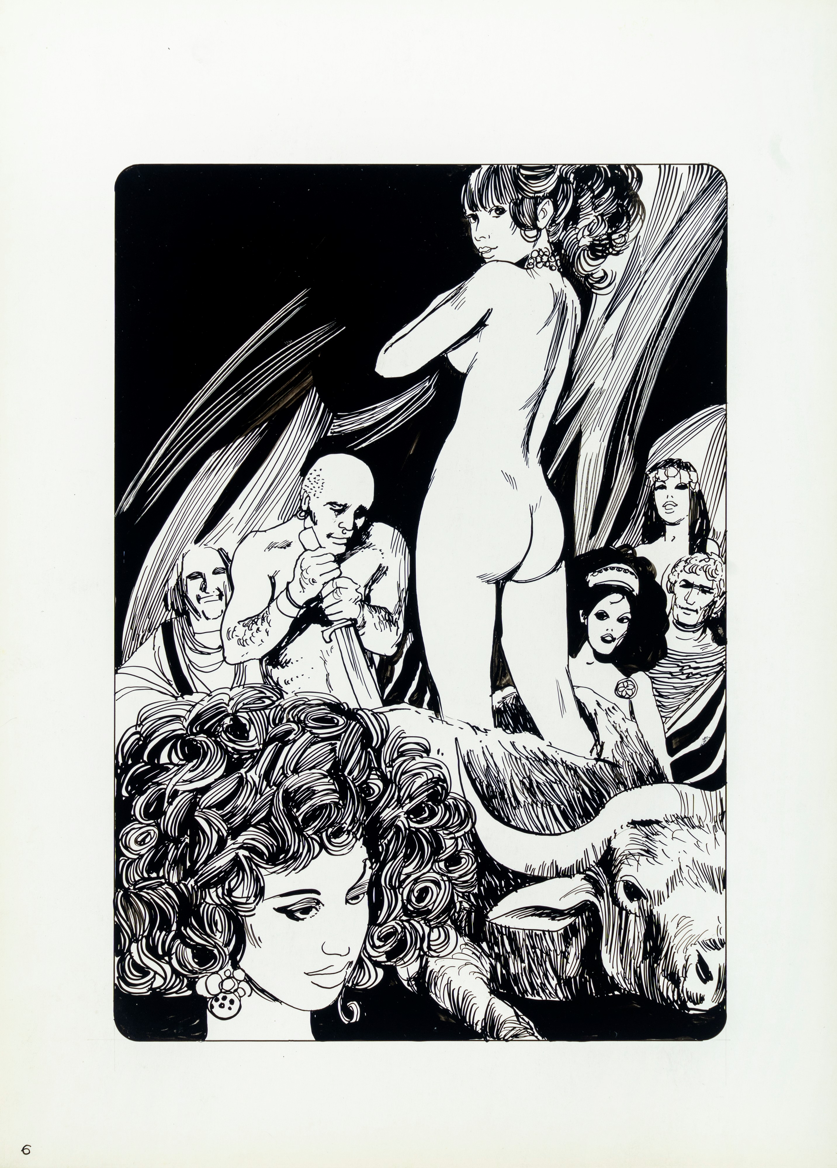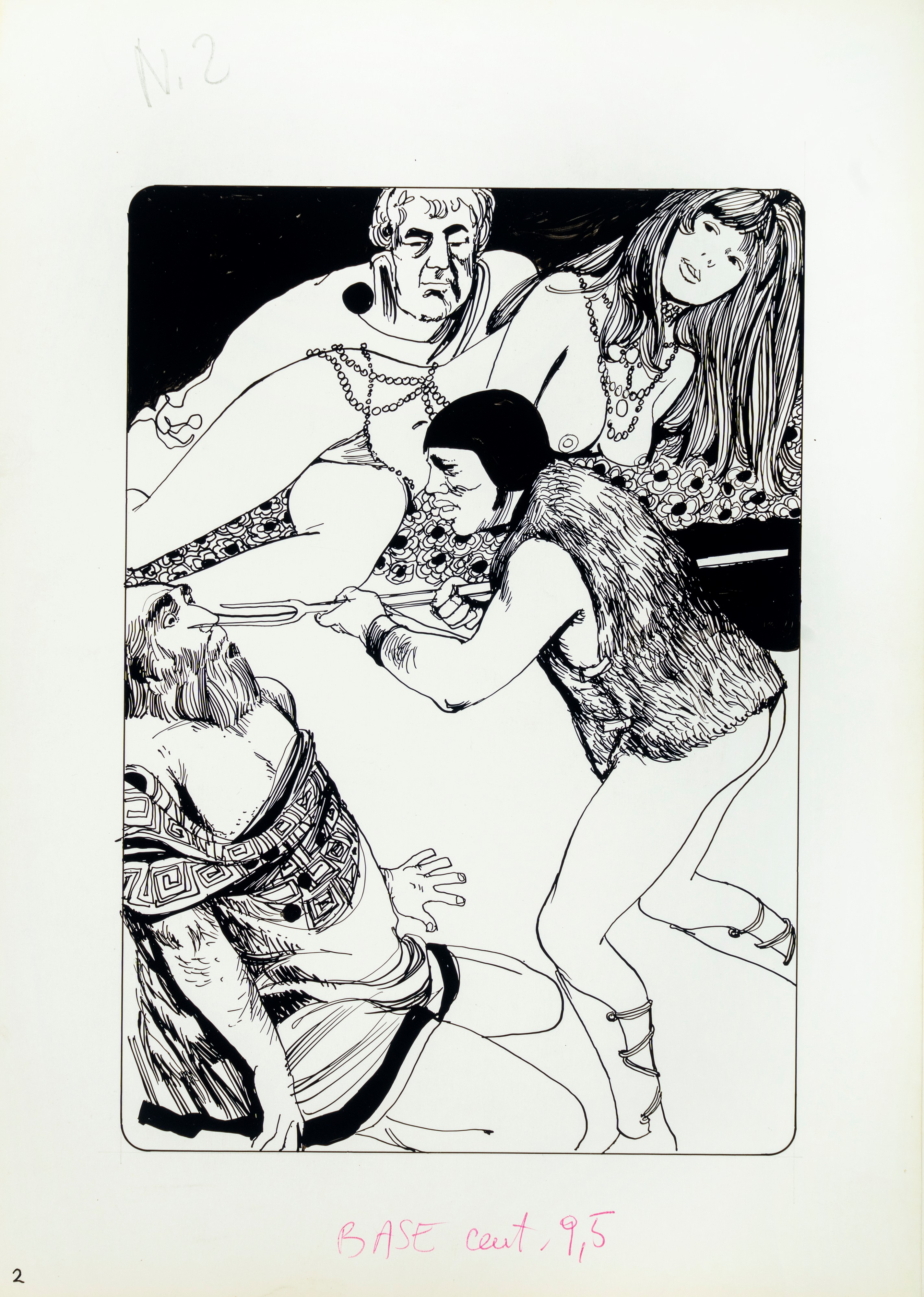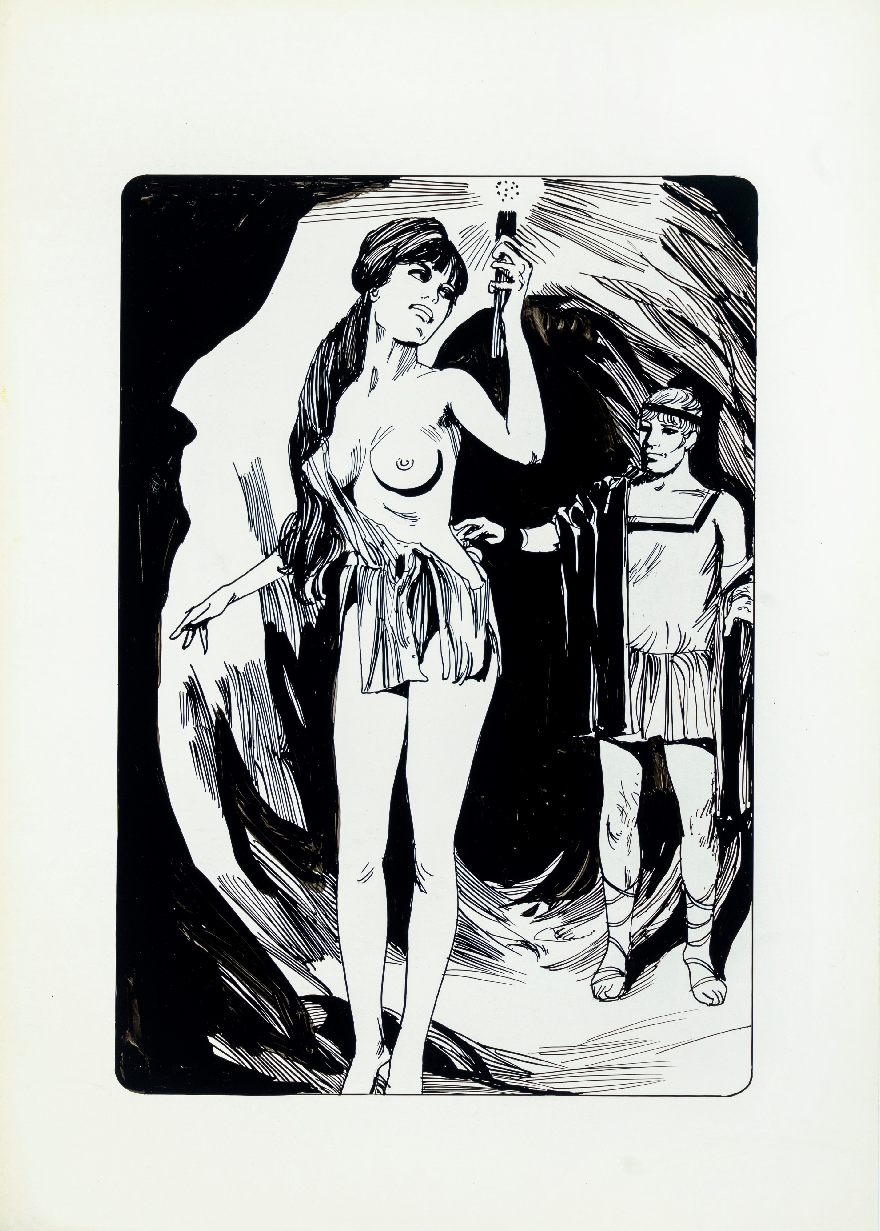 Lotto composto da 9 illustrazioni originali realizzate da Rostagno per il "Satiricon" di Petronio a cura di Pier Carpi, pubblicato come supplemento al Romanzo di Diabolik n. 5 da Sansoni Editore nel 1969.
