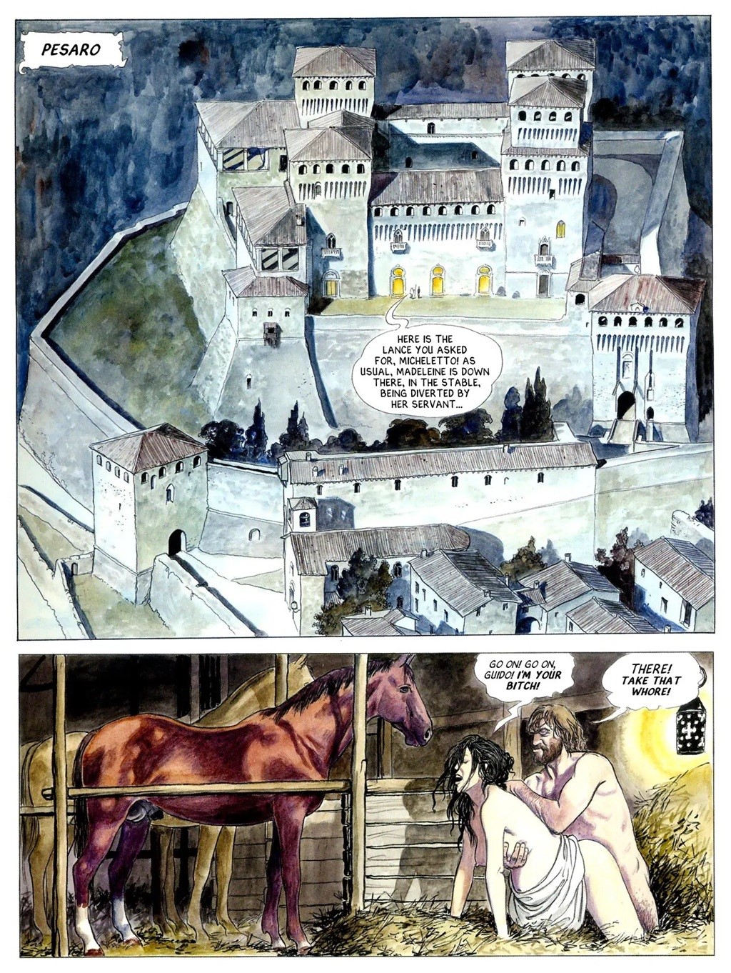 Tavola originale realizzata da Manara per "I Borgia: Il Potere e l'incesto", edita a pag. 34 del vol. 2 da Mondadori nel 2006. Sui testi di Alejandro Jodorowsky, Manara affresca una saga dalla grande componente erotico-shakspeariana narrando, tramite aneddoti e leggende, gli intrighi, le passioni e i più perversi segreti della famiglia Borgia e di papa Alessandro VI. Su due pannelli.