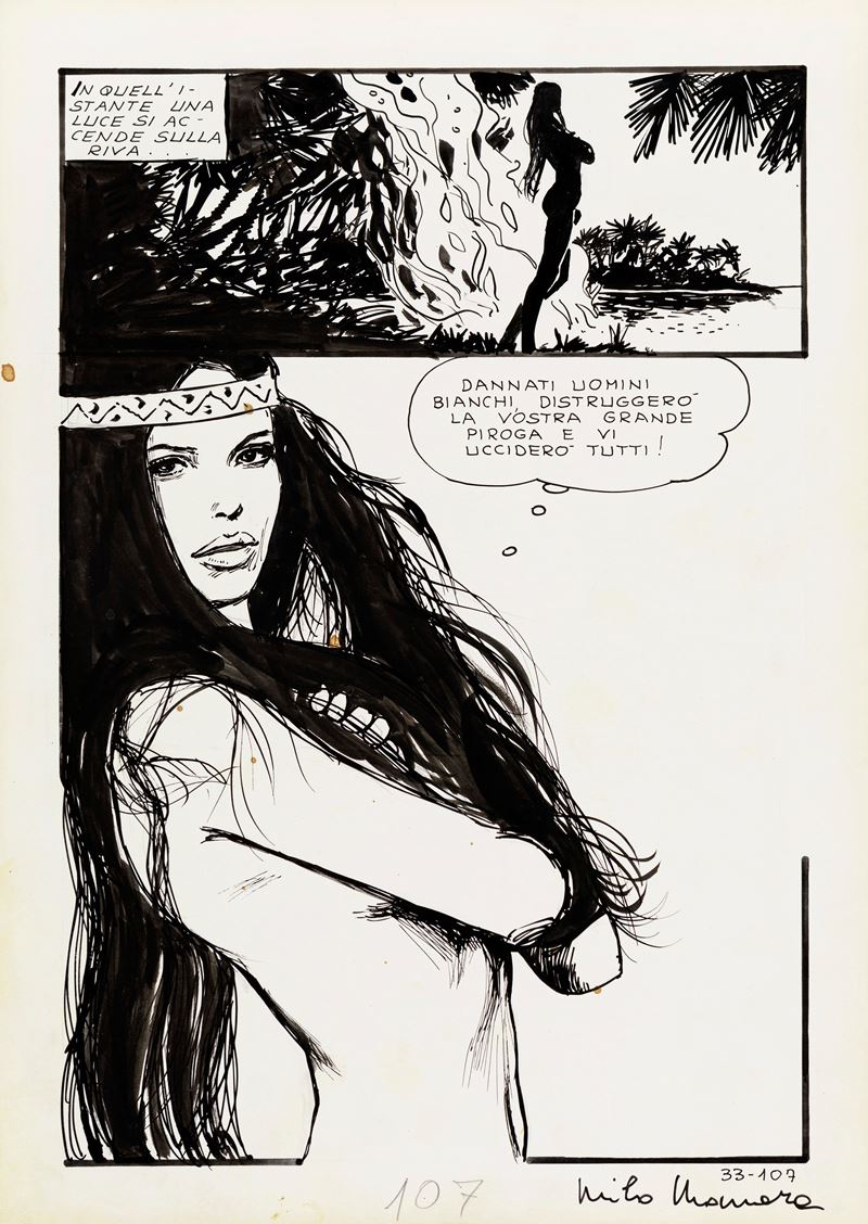 Tavola originale realizzata da Manara per "La prigioniera misteriosa", edita per la prima volta su Jolanda de Almaviva n. 33 a pag. 107 dalla Ediperiodici nel 1972. Il ventisettenne Manara all‘epoca alle prese con una delle tante pagine di Jolanda ci regala una delle immagini più seducenti della sua intera carriera, l‘opera fu inoltre pubblicata all‘interno del volume Milo Manara Glamour Book nel 1985. Firmata.