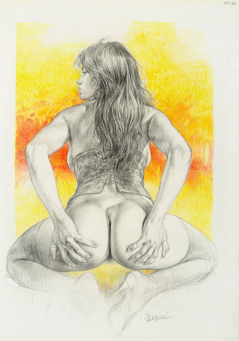 Illustrazione originale realizzata da Serpieri come omaggio alla sua Druuna, pubblicata per la prima volta negli anni '90 e successivamente nel volume "Foemina" da Lo Scarabeo nel 2006, oltre al portfolio "La donna di Serpieri" edito da Lo Scarabeo nello stesso anno. Serpieri è senza dubbio uno dei protagonisti assoluti del fumetto contemporaneo, soprattutto grazie alla celebre saga di "Druuna": l‘eroina creata nel 1988 che incarna, più di ogni altro personaggio, il suo grande amore per il femminile. Una donna che, per Serpieri, è sempre bella, sensuale, esuberante e carnale. Una donna che diventa protagonista di racconti western o di fantascienza, ma sempre avventurosa, risoluta, viva: non è mai una statua da venerare o un oggetto da possedere. Firmata.