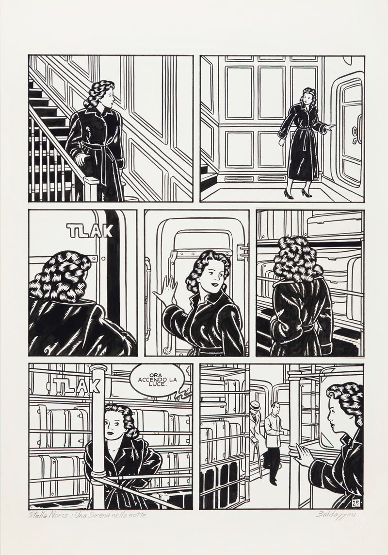 Tavola originale realizzata da Baldazzini per "Una sirena nella notte", pag. 25 di questa avventura di Stella Noris edita per la prima volta sulle pagine di Orient Express nel 1984. Firmata.