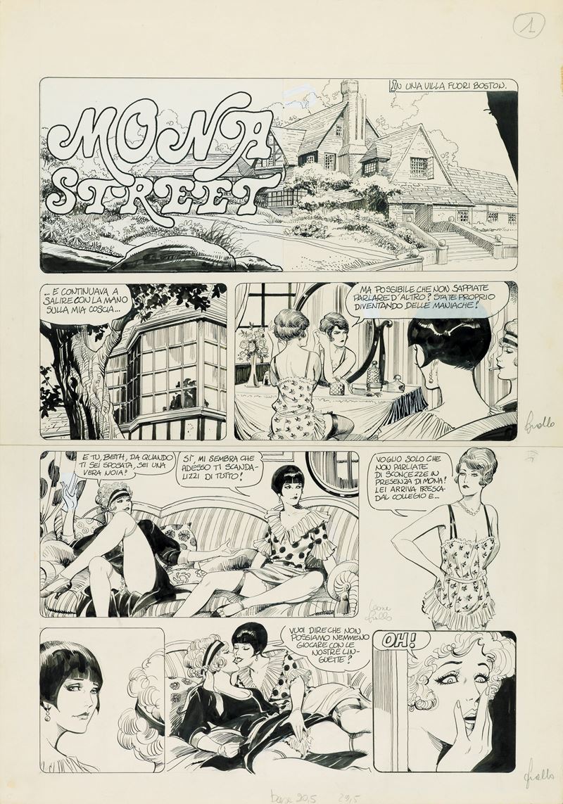Tavola originale realizzata da Frollo per "Entra in scena Mona Street", prima avventura erotica della sua Mona edita a pag. 1 nel volume Mona Street 1: The Secret Books of Glamour dalla Glamour International nel 1988. Pubblicata in Francia nello stesso anno con il titolo "L'entrée en scène de Mona Street", segna la consacrazione di Frollo nell'Olimpo del fumetto erotico d'autore a livello mondiale. Siamo nella Boston degli anni Venti del Novecento, Mona Street è una scaltra fanciulla da poco uscita dal college, curve morbide candidamente ostentate, un viso innocente dallo sguardo ironico e un sorriso appena accennato sulle labbra. Mona Street è un normale nome inglese, ma se si pensa che Leone Frollo è veneziano allora il giocoso equivoco verbale diventa intuitivo. L'ammiccamento malizioso c'è già nel nome, dunque, ma tutte le storie di Mona Street sono sottese di ammorbante erotismo, ingegnosamente narrate dall'autore che, con un tratto morbido e voluttuoso a matita o china, ha tracciato un personaggio ben diverso dalle altre "eroine del fumetto" quasi sempre succubi dell'uomo: Mona ha una personalità da falsa ingenua che si prende gioco di tutti, diventando a volte vindice del proprio sesso. Su due pannelli. Firmata.