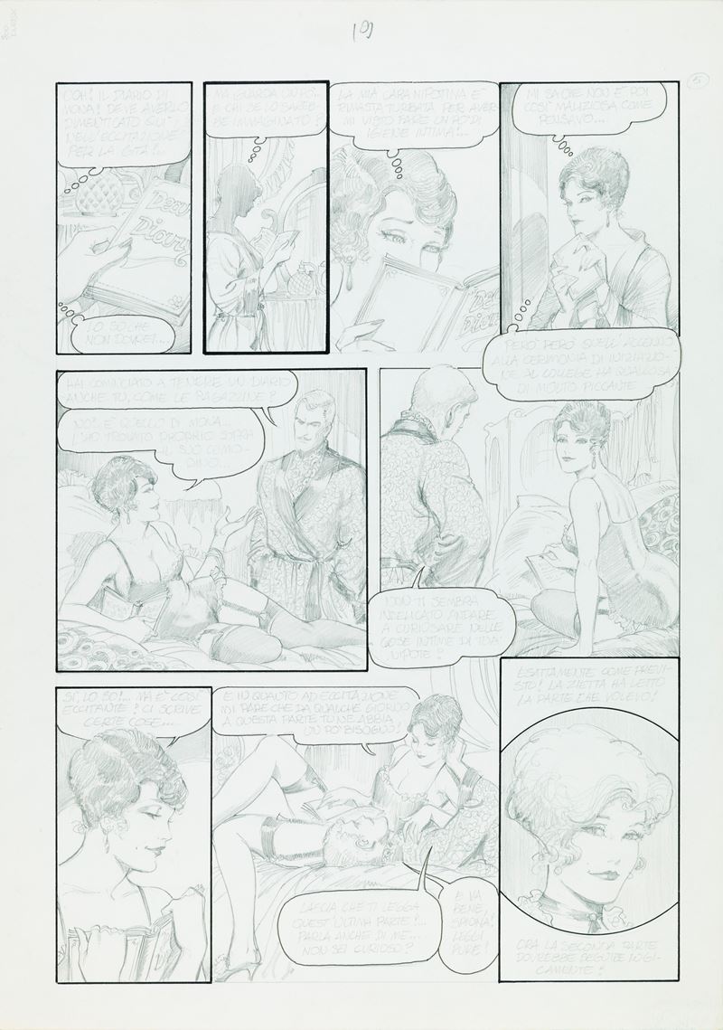 Tavola originale realizzata da Frollo per "Lezioni di Igiene", avventura erotica della sua Mona edita a pag. 5 nel volume Mona Street 3: The Secret Books of Glamour dalla Glamour International nel 1995. Pubblicata in Francia nello stesso anno con il titolo "Toilette Intime", segna la consacrazione di Frollo nell'Olimpo del fumetto erotico d'autore a livello mondiale.