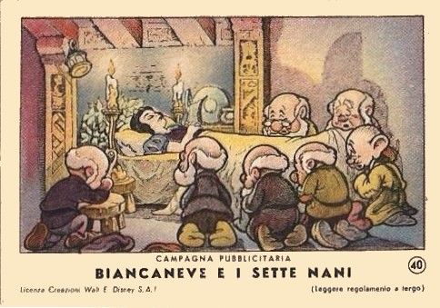 Disegno originale realizzato da Zucchi per la figurina n. 40 della raccolta per il concorso Elah "Biancaneve e i sette nani", distribuita in omaggio con i prodotti Elah nel 1939 e prodotte dalla Gros Monti&C di Torino, unico concessionario Disney in Italia dell´epoca.