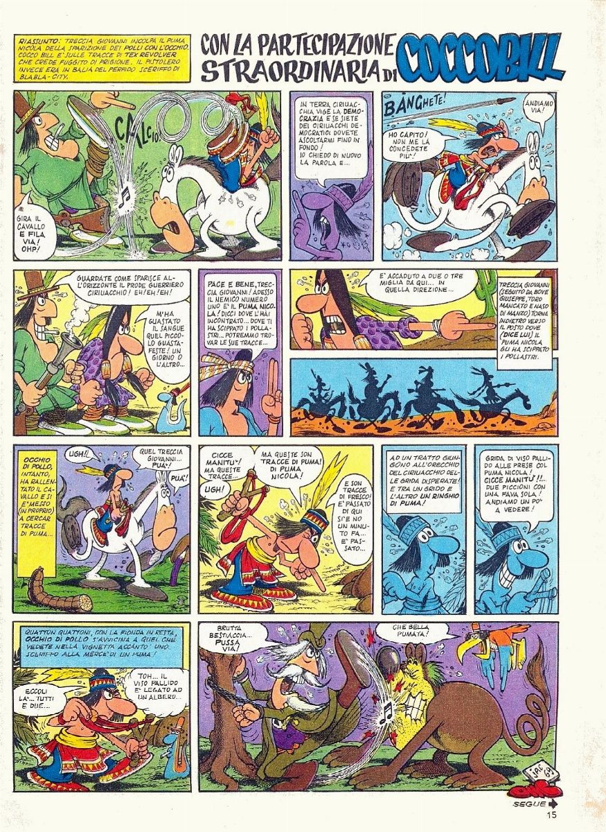Tavola originale realizzata da Jacovitti per la ventiquattresima avventura di Cocco Bill intitolata "Occhio di Pollo e... i polli con l'occhio", pag. 17 edita per la prima volta sulle pagine del CdP n. 1 del 1970. Acquerellata con timbro editoriale al retro. Firmata e datata con lisca di pesce.