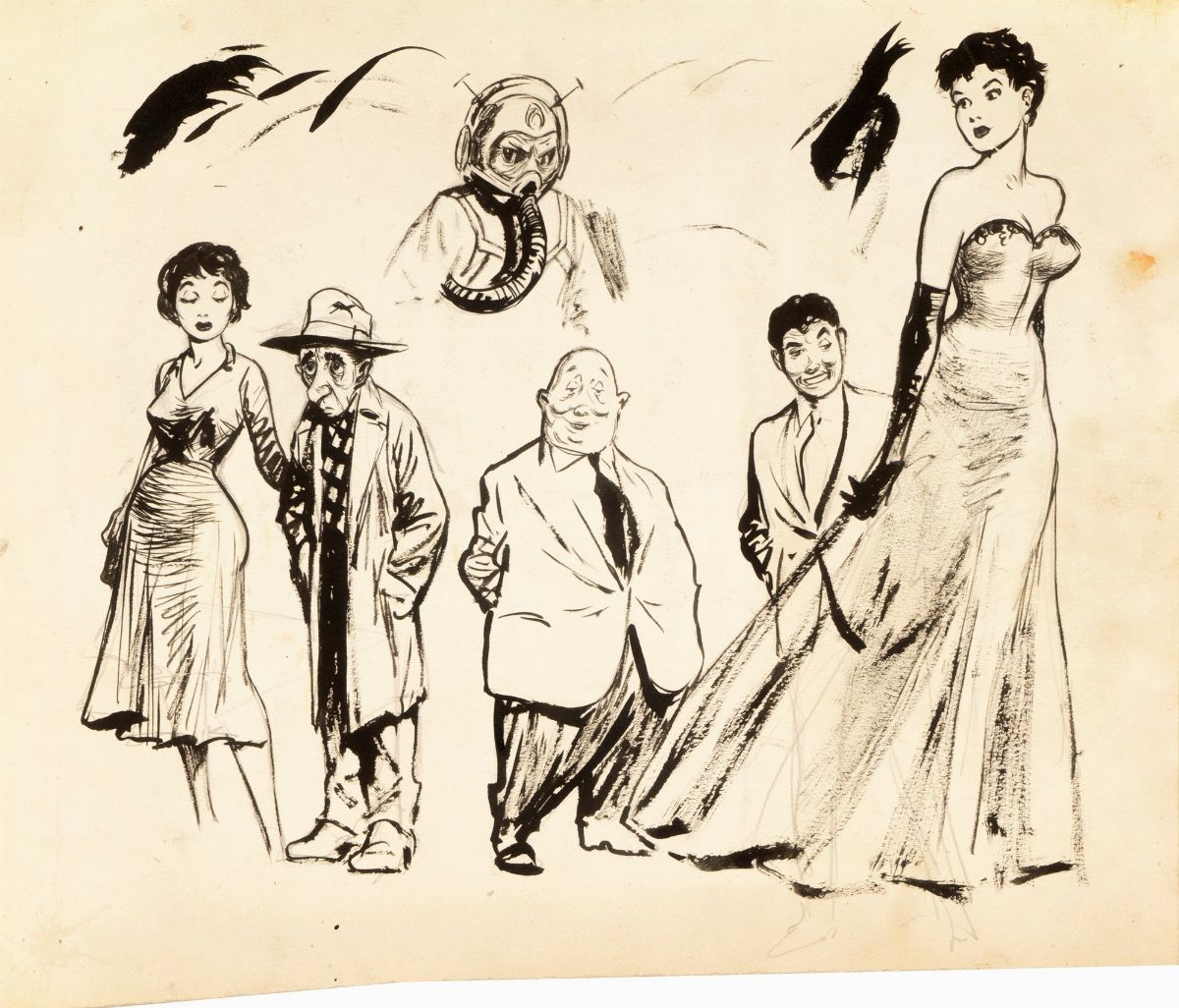 Illustrazione (fronte e retro) realizzata da Buzzelli durante gli anni '50. Un meraviglioso campionario di variegata umanità come solo un maestro come Buzzelli sapeva mettere in scena. Firmata.