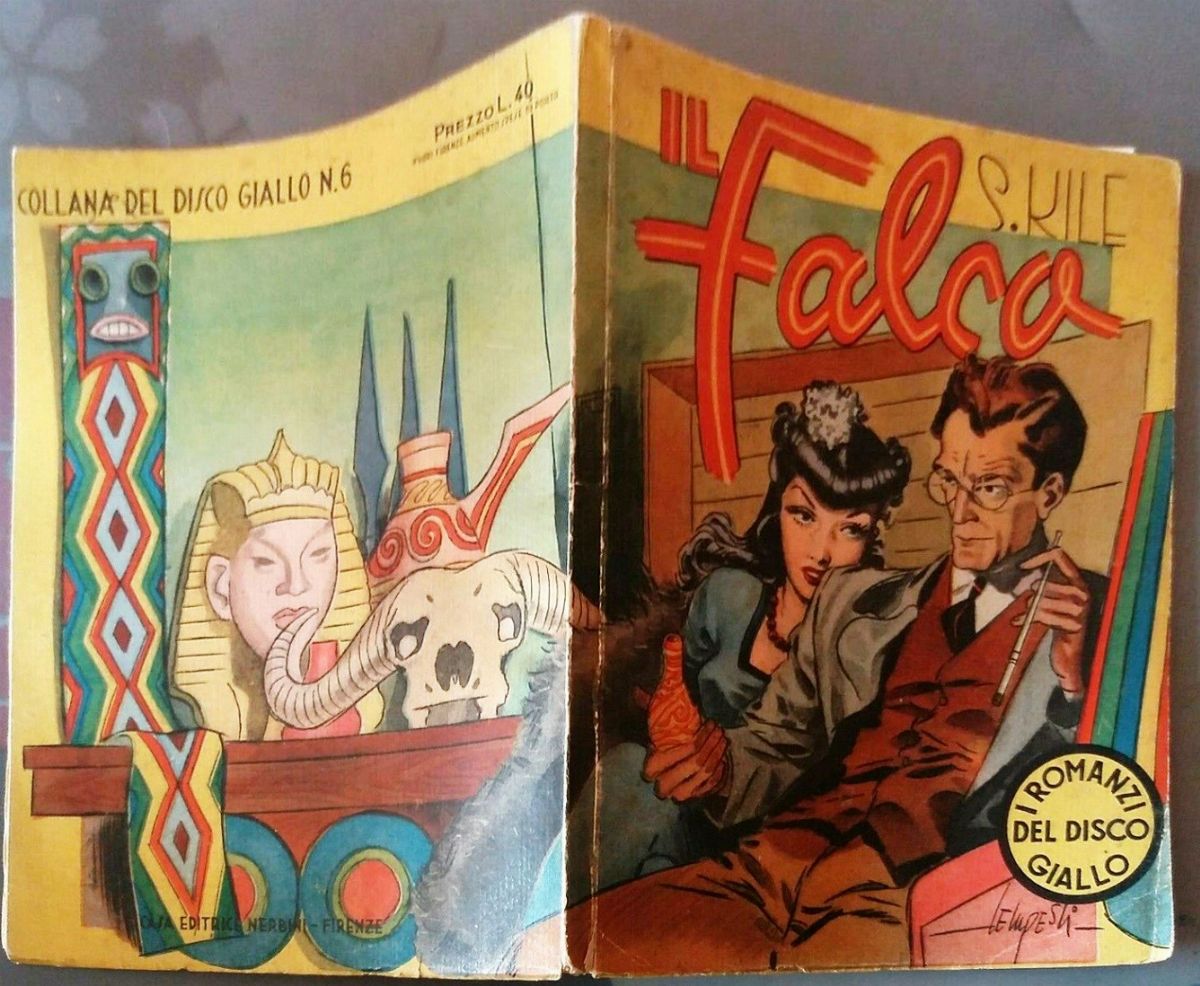 Originale di copertina (e quarta di copertina) realizzato da Tempesti per il romanzo Il Falco" di Sefton Kile, edito nella collana Romanzi del disco giallo n. 6 dalla Nerbini nel 1946. Lievi pieghe al margine superiore. Firmato.