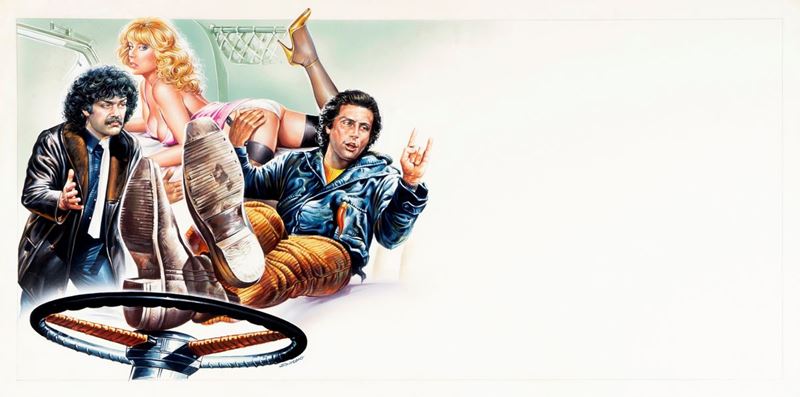 Bozzetto originale realizzato da Spataro per la locandina ufficiale del film "I camionisti", diretto da Flavio Mogherini con Andrea Roncato, Gigi Sammarchi e Daniela Poggi nel 1982. Firmato.