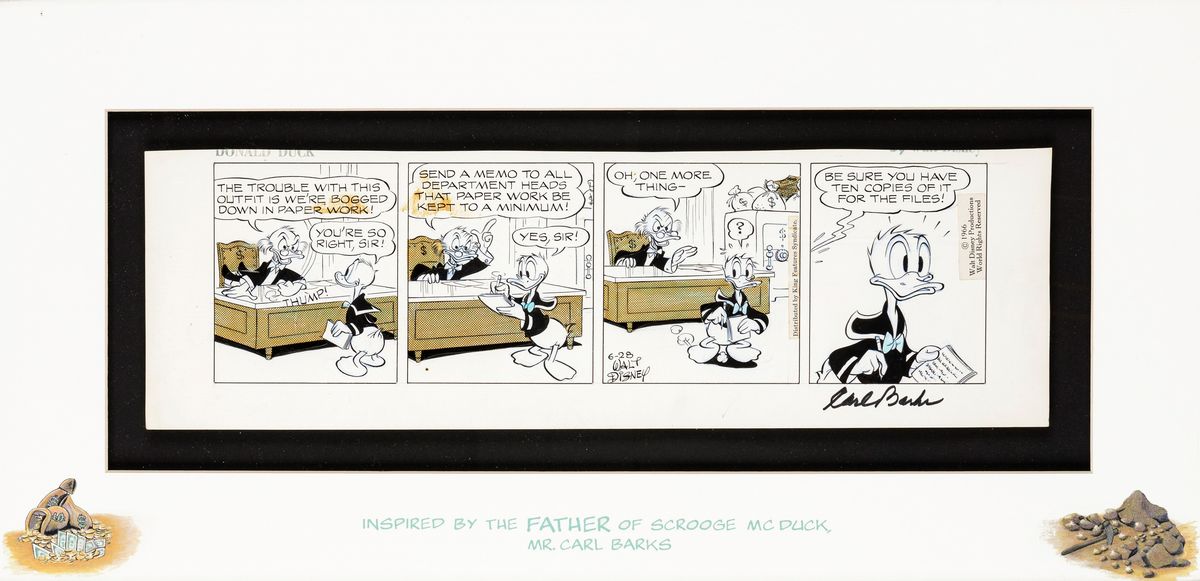 Striscia giornaliera del 28/06/1966 per "Donald Duck". Nel 2000 la Disney Art Classics propose una serie di strisce storiche realizzate negli anni da vari autori Disney come omaggio al maestro Carl Barks, creatore di Zio Paperone e simbolo di un'intera generazione di appassionati, Barks firmò personalmente ognuna di queste strisce. Una delle tipiche sfuriate di Paperone al povero Paperino, Barks e Taliaferro due tra i più grandi maestri Disney di sempre, nel suo passepartout con certificato di autenticità, un pezzo da museo. Si allega il certificato di autenticità della Walt Disney Art Classic. Firmata Walt Disney e da Carl Barks.