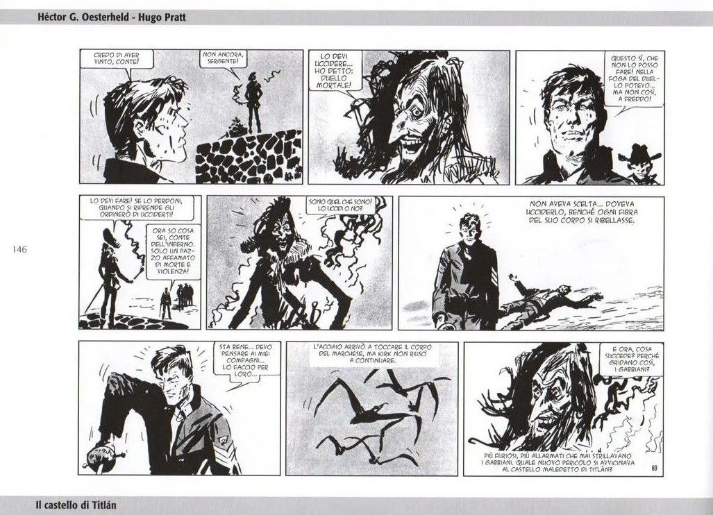 Tavola originale realizzata da Pratt per "Il castello di Titlàn", pag. 69 dell´ultima avventura de Il Sergente Kirk pubblicata per la prima volta in Argentina su Hora Cero Suplemento Semanal n. 86 dall´Editorial Frontera nell´Aprile 1959, ristampata in Italia nel volume "Il Sergente Kirk" dalla ANAFI nel 2008. Lievi pieghe e un piccolo strappo al margine superiore.