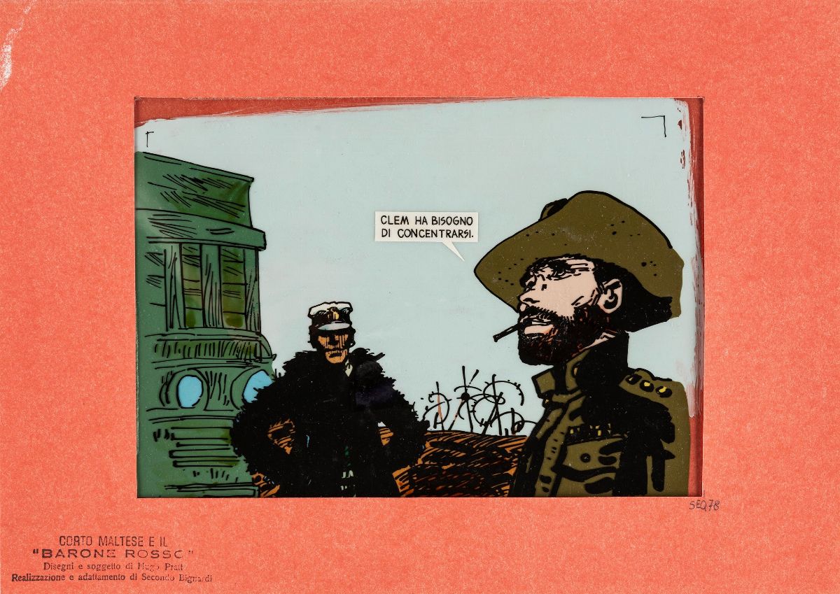 Cel originale su due fogli realizzata dallo Studio Bignardi per "Barone Rosso", episodio della serie su Corto Maltese frutto della collaborazione di Pratt con lo studio di animazione modenese, episodio trasmesso per la prima volta durante la trasmissione SuperGulp! Fumetti in TV nel 1977. (https://www.bignardi.it/filmografia/il-barobne-rosso).