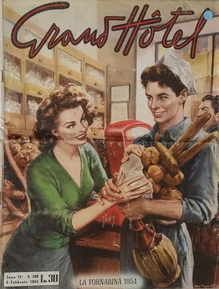 Originale di copertina realizzato da Molino per la rivista Grand Hotel n. 398 nel 1954. L‘opera fu ristampata per il mercato francese sul magazine Nous Deux. Lievi pieghe agli angoli. Firmato.