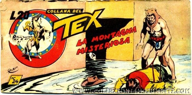 Originale di copertina realizzato da Galep per "La montagna misteriosa", edito per la prima volta nel formato a striscia su Tex serie V n. 24 dalla Casa Editrice Audace (futura Bonelli) nel 1952. Il titolo della striscia fu rimaneggiato dallo stesso Galep qualche mese più tardi per la ristampa di Tex Serie Bianca n. 21. Una delle primissime copertine di Tex, di grande rarità. Si allega la velina con le indicazioni colore. Quattro fori al margine destro. Firmato.