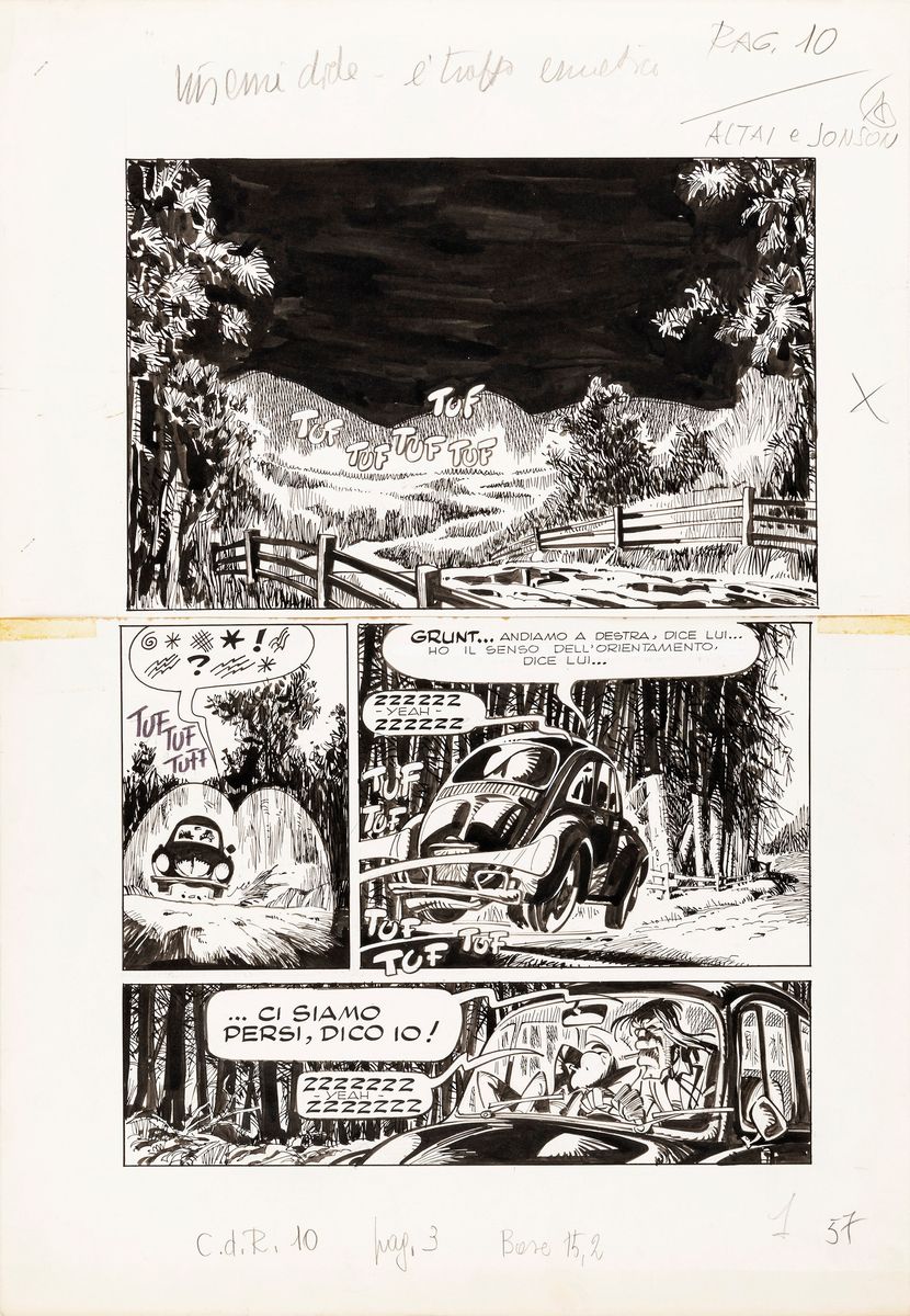 Title page originale realizzata da Cavazzano per "Notte senza luna", l'undicesimo episodio della mitica serie Altai & Jonson pubblicato sul CdR n. 10 nel 1976. Nati nel 1975 dal fervido genio di Tiziano Sclavi e dal magistrale pennello di Giorgio Cavazzano, Altai & Jonson sono la parodia dei vari Starsky e Hutch dei film e telefilm polizieschi americani che spopolavano negli anni'70, diventando presto un titolo di culto tra gli amanti del genere. Il primo pannello di questa pagina fu sostituito con un titolo fotostatico (compreso in questo lotto). Su due pannelli.