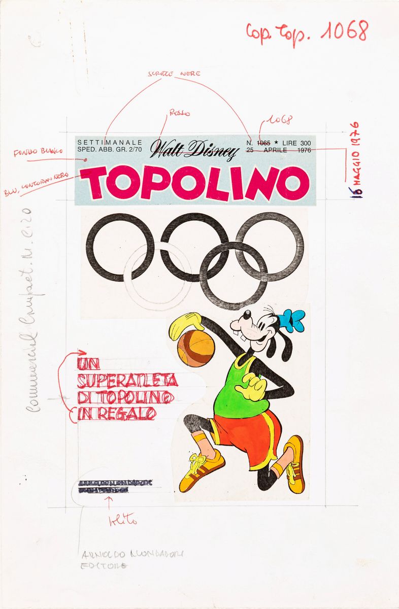 Originale di copertina realizzato da Rota per Topolino n. 1068 del Maggio 1976. Una delle celebri copertina olimpioniche rimaste nel cuore di tutti gli appassionati Disney. Si allega la prova colore a tempera su fotocopia. Due piccoli fori all'angolo superiore destro.