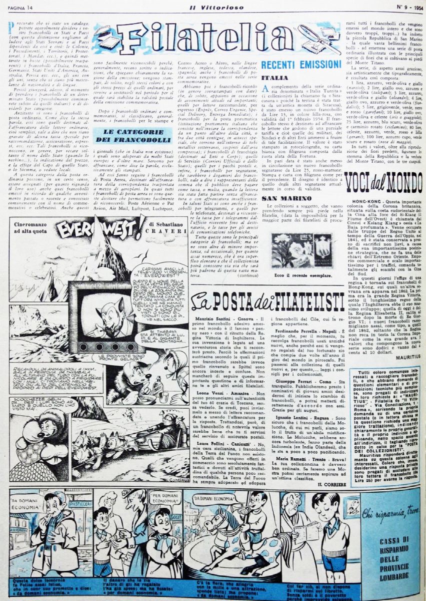 Title page originale realizzata da Craveri per "Everowest!", edita su Il Vittorioso n. 9 dalle edizioni A.V.E. nel 1954. Colonna portante del giornale cattolico fin dal 1937, Craveri ci regala questa storia capolavoro definita « cineromanzo ad alta quota » che vede come protagonisti i suoi celebri animali antropomorfi di Zoolandia; questa inedita famiglia di animali era composta dal saggio Giraffone che era quasi un padre per il maiale Porcellino, l'orsetto Carboncino, la scimmia Jojo, il gatto Micio e il pesce Aprilino, a cui la volpe Birba faceva da madre. Fori di affissione ai margini. Acquerellata al retro.