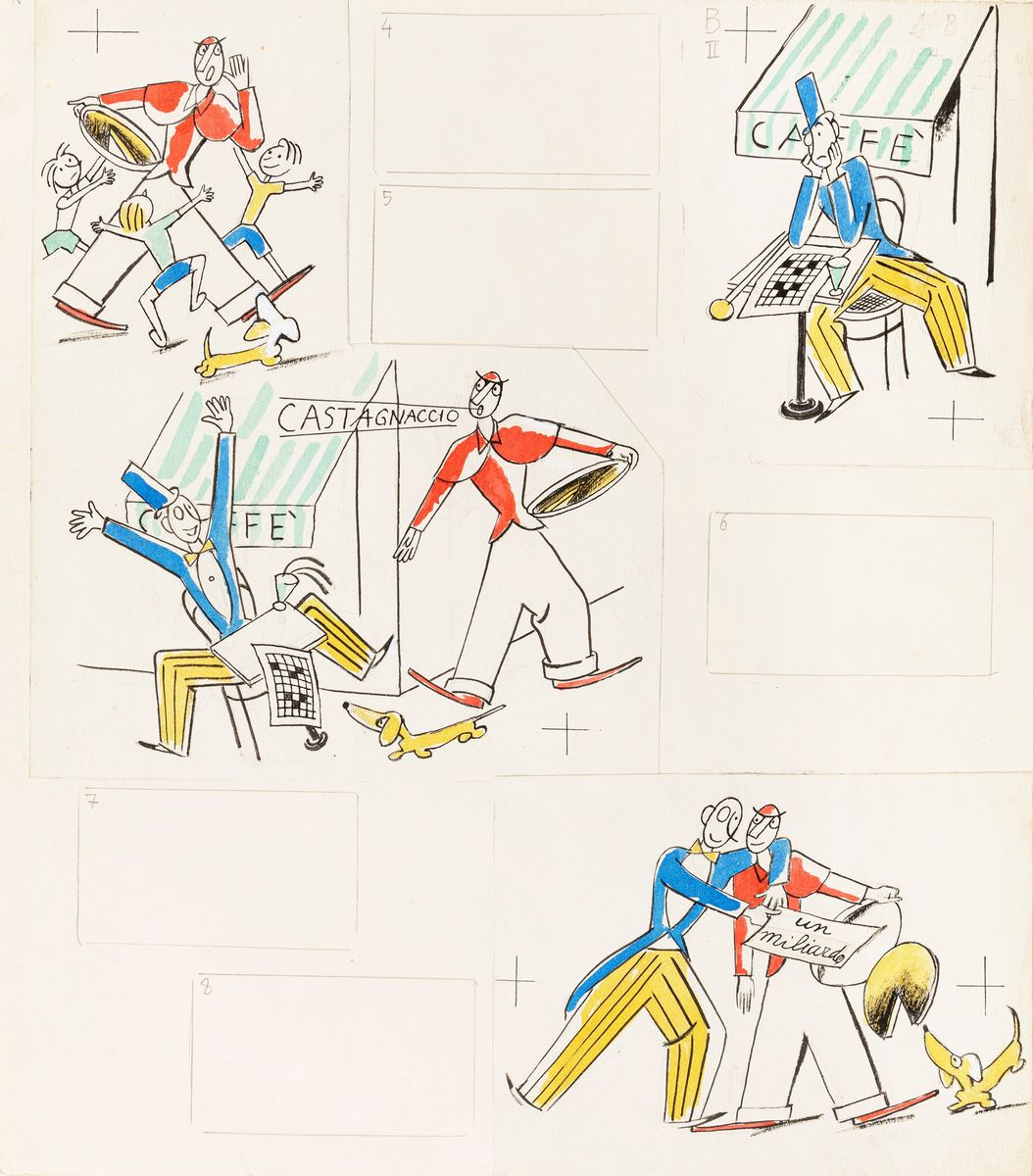 Storia autoconclusiva di 2 tavole originali realizzate da Tofano durante gli anni ’30 per la serie delle avventure del Signor Bonaventura. Ideato nel 1917 e pubblicato dal CdP fino al 1978, il personaggio è entrato col suo proverbiale milione nella cultura italiana del Novecento. Molte storie classiche, come quella qui presentata, furono ristampate negli anni successivi modificando per l’occasione la dicitura "un milione" (di lire) con "un miliardo", applicando una semplice pecetta con la nuova cifra.