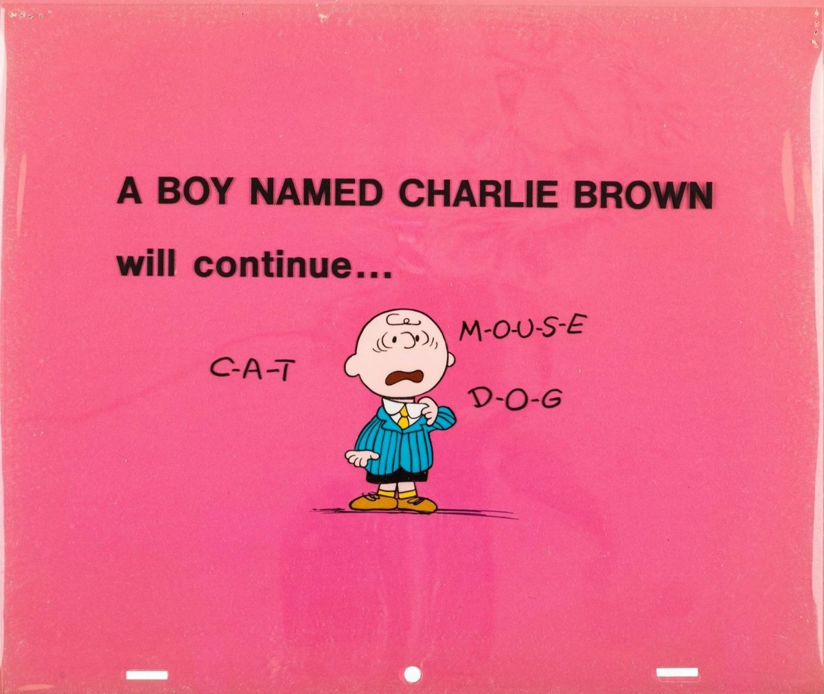 Cel originale (3 fogli) realizzata da Melendez per il primo lungometraggio dei Peanuts "A Boy Named Charlie Brown", distribuito nella sale nel 1969. La presente cel, che vede Charlie Brown alle prese con la temutissima gara di spelling, fu successivamente utilizzata come stacco pubblicitario nella versione televisiva del film.