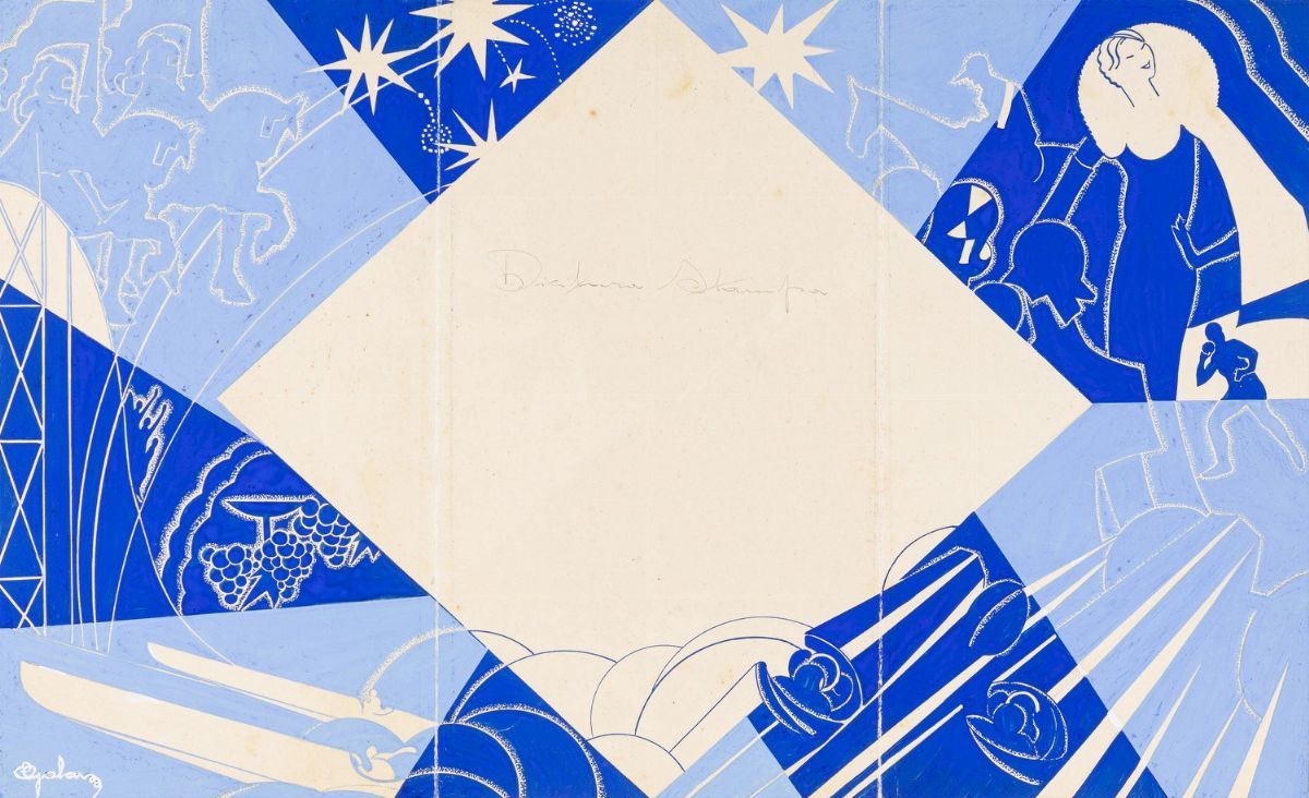 Illustrazione originale (al fronte e al retro) realizzata da Galaverna per un pieghevole pubblicitario edito in occasione delle Manifestazioni Torinesi del 1933. Due pieghe in corrispondenza delle pieghe editoriali. Firmata al fronte e al retro.