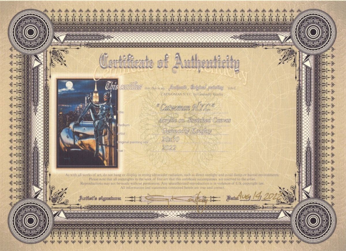 Dipinto originale realizzato dal maestro europeo delle pin-up Koufay, titolata "Catwoman N.Y.C.". Si allega il C.o.a. rilasciato dall'artista. Firmato.
