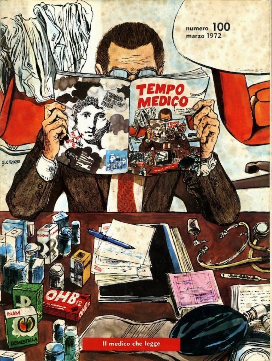 Originale di copertina realizzato da Crepax per la rivista Tempo Medico n. 100 del Marzo 1972. La collaborazione del maestro milanese con la rivista di informazione, dossier, cultura e attualità medica ebbe inizio nel 1958 e contribuì fortemente alla sua formazione artistica. Firmata.