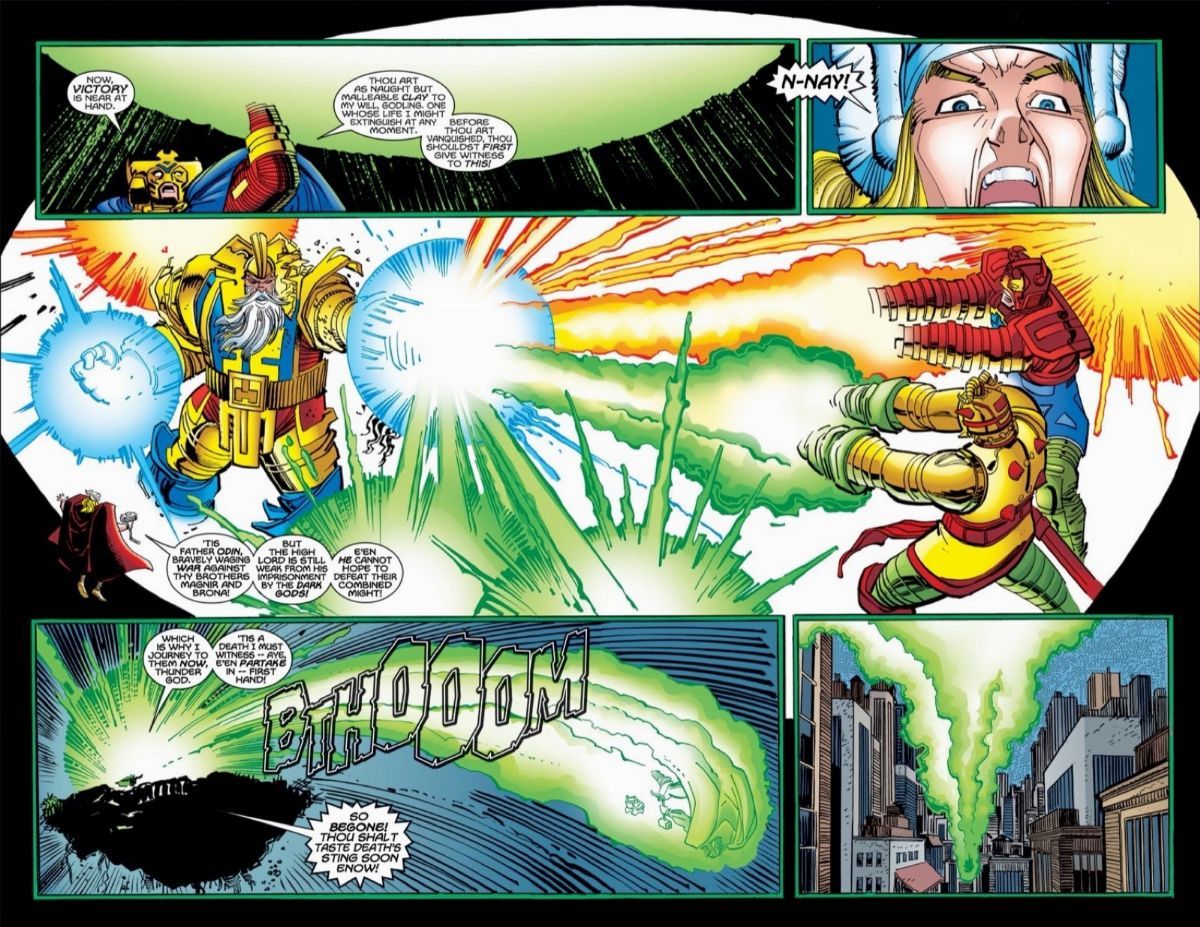Doppia tavola originale realizzata da Romita Jr. per "Revenge of the Enchanters", edita su Thor n. 16 alle pagg. 19 e 20 dalla Marvel nel 1999. Su due pannelli.