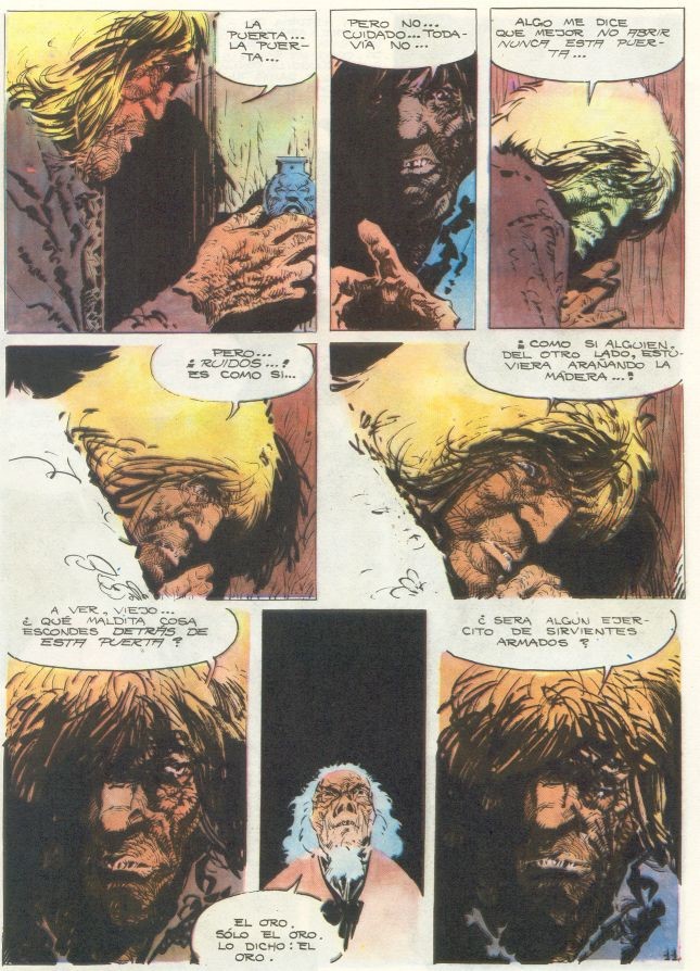 Tavola originale realizzata da Breccia per la pag. 11 di "No, no abras nunca esa puerta", storia pubblicata per la prima volta in Argentina su Skorpio Plus n. 2 dalle Ediciones Record nel 1984. Lievi pieghe agli angoli.