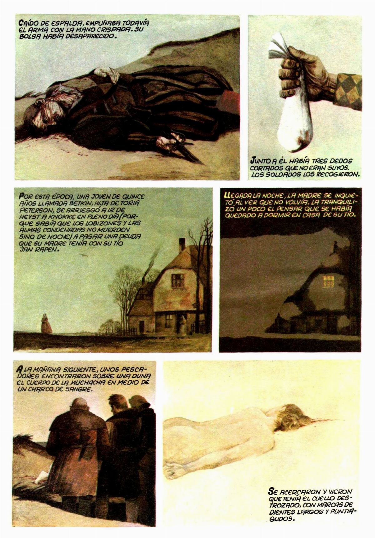 Tavola originale realizzata da Breccia per la pag. 2 della storia breve "La leggenda di Till Ulenspiegel", edita per la prima volta in Italia su Alter Alter n. 1 del 1977. Fori di affissione e lievi pieghe agli angoli. Firmata e datata.