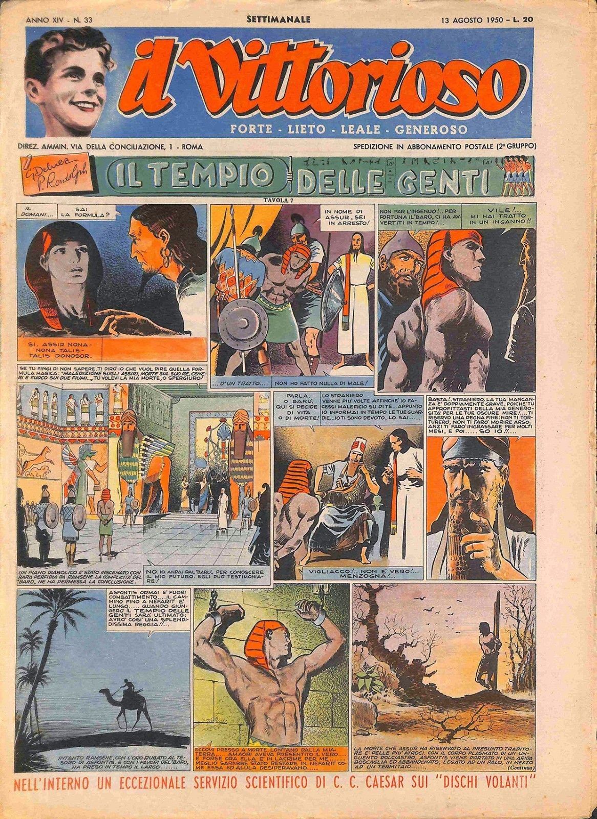 Tavola originale realizzata da De Luca per la pag. 7 de "Il tempio delle genti", pubblicata per la prima volta sulle pagine de Il Vittorioso n. 33 nel 1950. Da notate l’uso del chiaroscuro, che spesso De Luca abbandonerà in favore di una sua originale linea chiara e poi di un pointillisme affine a quello di Caprioli ma risolto in chiave espressionista, invece che naturalistica. Acquerellata al retro. Alcune pieghe.
