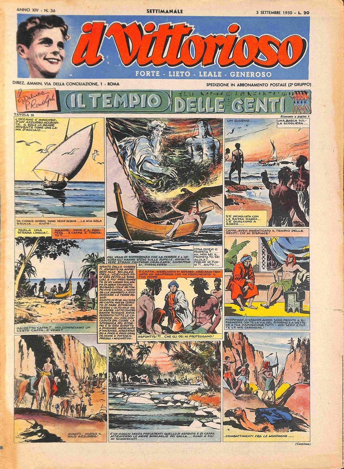 Tavola originale realizzata da De Luca per la pag. 10 de "Il tempio delle genti", pubblicata per la prima volta sulle pagine de Il Vittorioso n. 36 nel 1950. Da notate l’uso del chiaroscuro, che spesso De Luca abbandonerà in favore di una sua originale linea chiara e poi di un pointillisme affine a quello di Caprioli ma risolto in chiave espressionista, invece che naturalistica. Acquerellata al retro. Alcune pieghe.