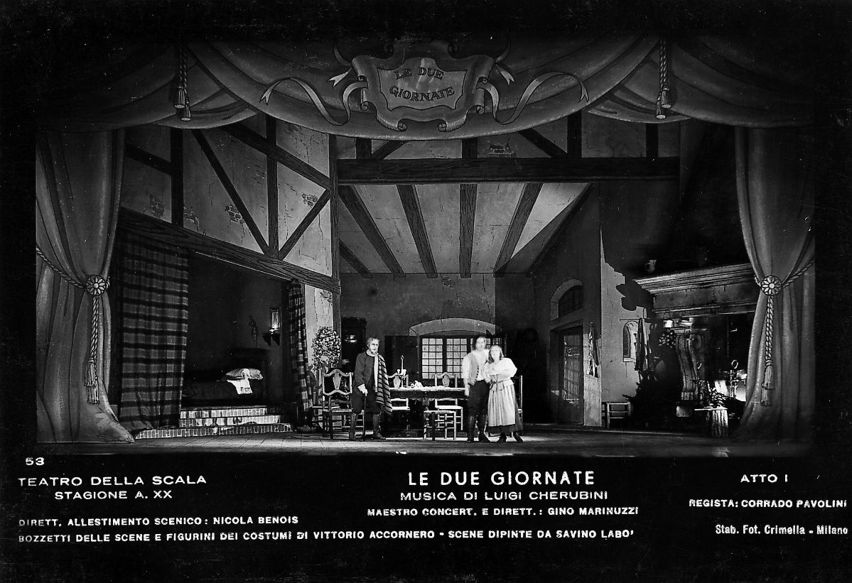 Illustrazione originale realizzata da Accornero per la scenografia teatrale dell'opera "Le due giornate" di Luigi Cherubini andata in scena al Teatro della Scala di Milano con la regia di Corrado Pavolini nel 1942. Piccole ammaccature agli angoli. Firmata, datata e titolata.