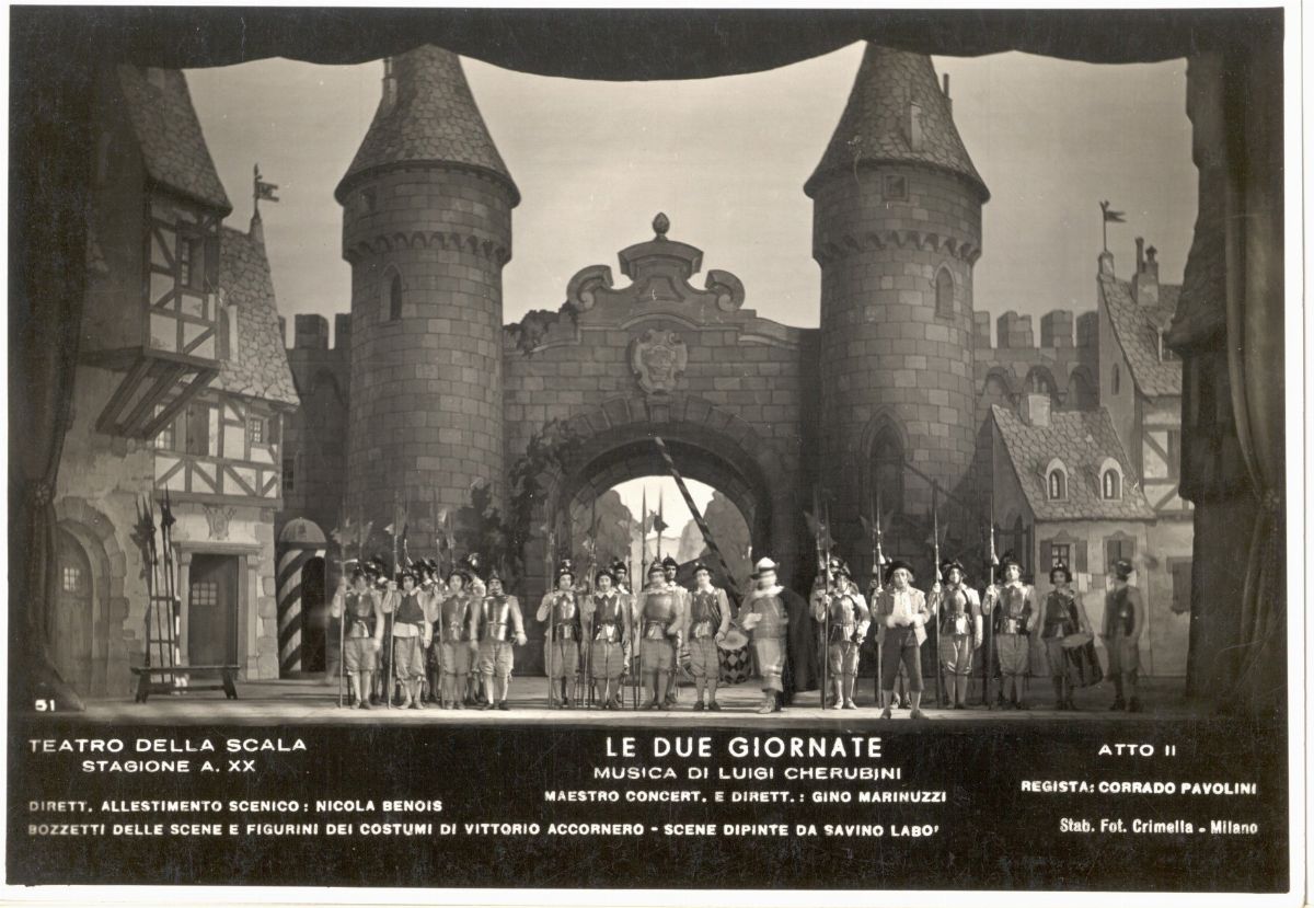 Illustrazione originale realizzata da Accornero per la scenografia teatrale dell'opera "Le due giornate" di Luigi Cherubini andata in scena al Teatro della Scala di Milano con la regia di Corrado Pavolini nel 1942. Piccole ammaccature agli angoli. Firmata, datata e titolata.
