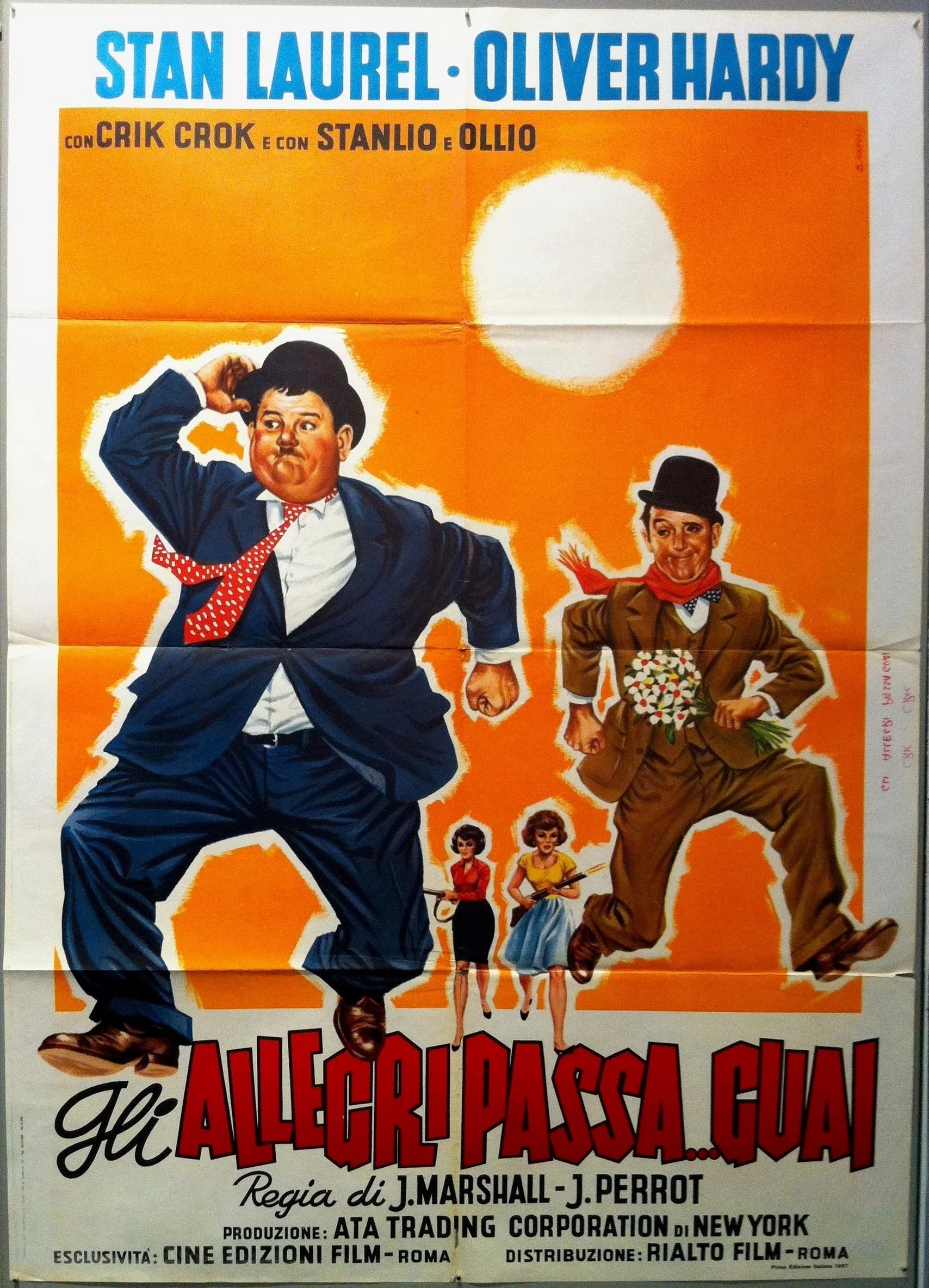 Bozzetto preliminare realizzato da Napoli per la locandina ufficiale del film "Gli allegri passaguai", diretto da Frank Llyod con Oliver Hardy e Stan Laurel nel 1968. Alcune pieghe.