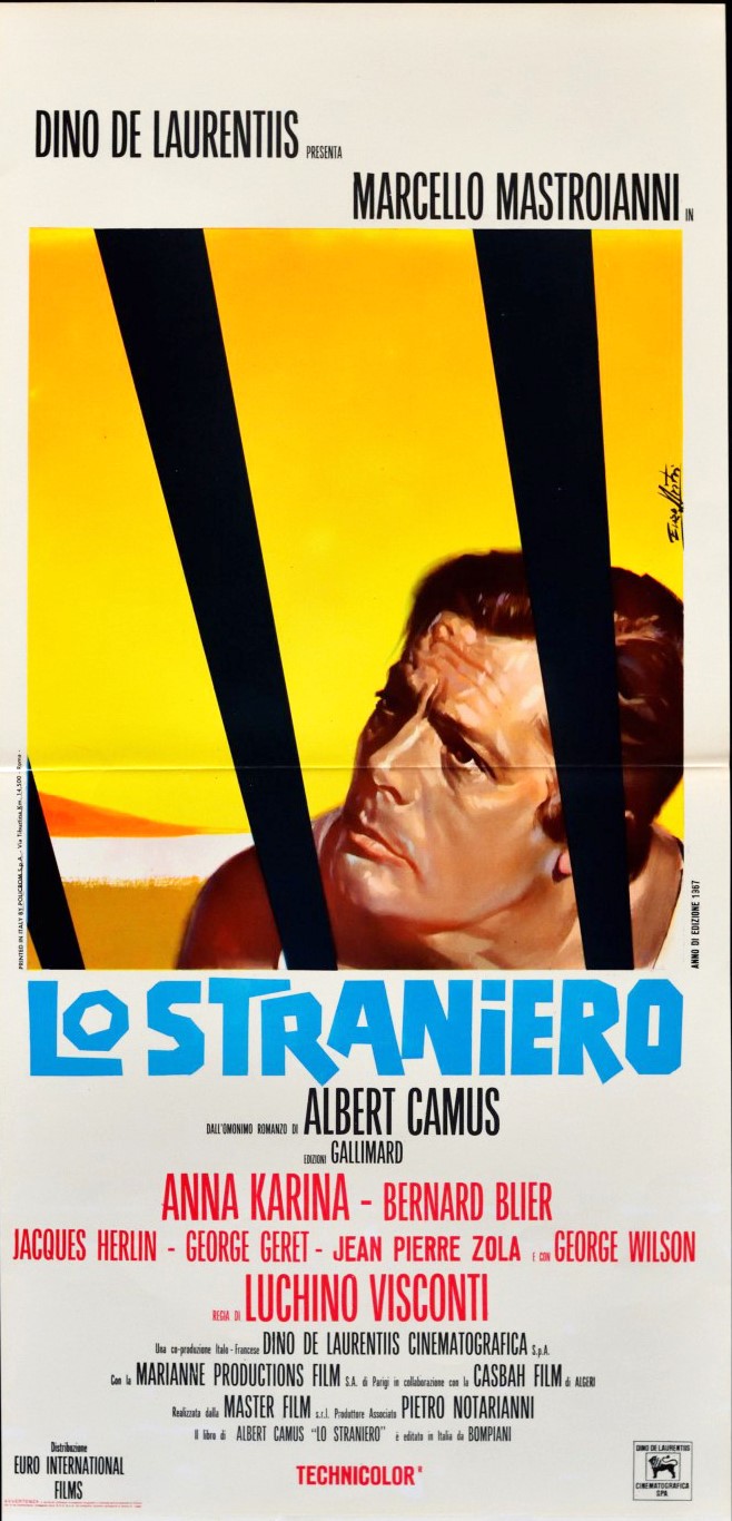 Bozzetto originale realizzato da Enzo Nistri per la locandina ufficiale del film "Lo straniero", diretto da Luchino Visconti con Marcello Mastroianni e Anna Karina nel 1967. Fori di affissione ai margini, abrasione e lieve piega all'angolo inferiore destro, lieve imbarcatura dal cartone. Firmato.